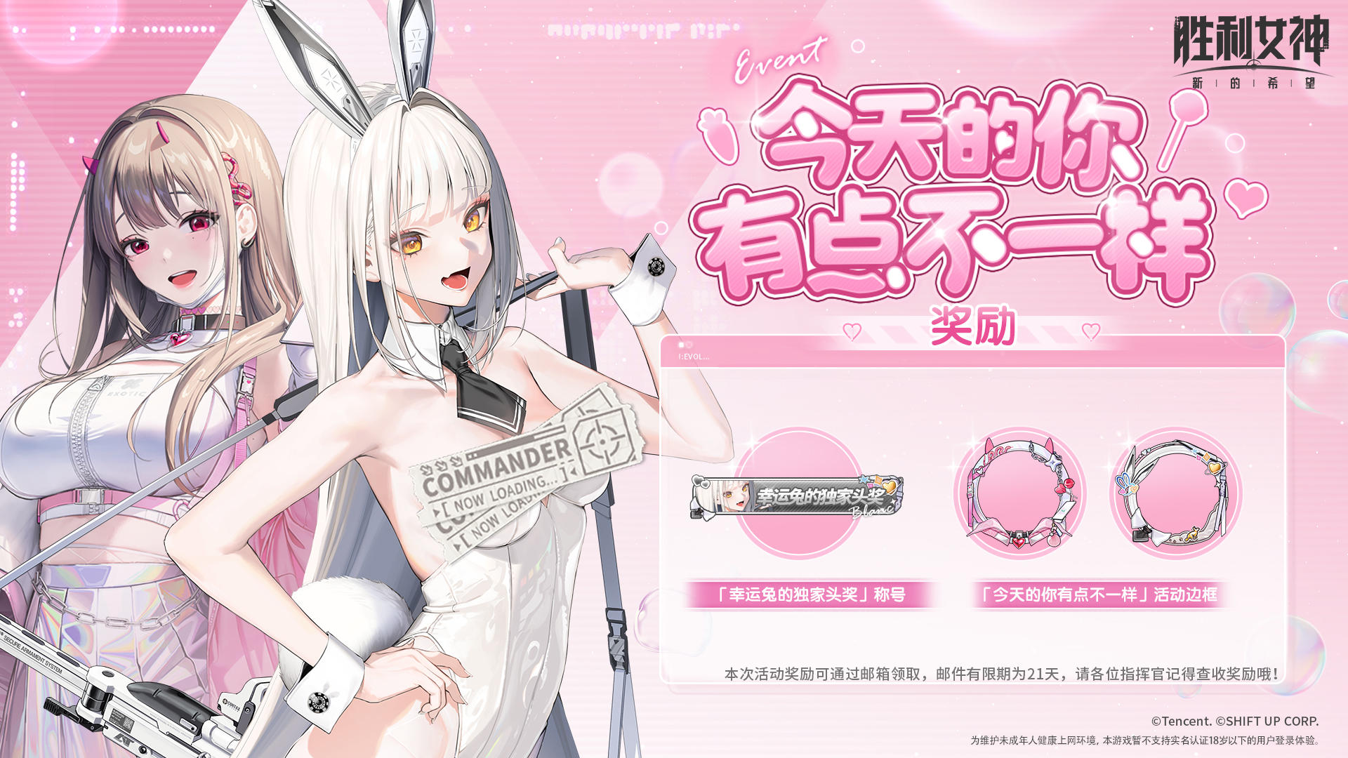 感谢您坚定地选择了布兰儿与毒蛇。您的这份心意将会被彼此珍藏,成为独一无二的回忆。我们为您准备了专属的头像框(「今天的你有点不一样」活动边框*2)与称号奖励(「幸运兔的独家头奖」称号),作为本次活动的特别纪念。本次活动奖励已通过邮箱送达。邮件有限期为21天,请各位指挥官记得查收奖励哦!#胜利女神新的希望 #nikke