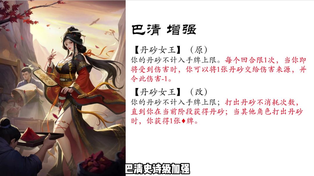 唐 李世民 5体力 唐太宗技能: 一:雄才大略:摸牌阶段,你改为摸手牌上限的半数张牌。二:万国来朝:其他角色每打出/弃置五张获得过的你的牌时,你摸两张牌。三:贞观之治:每名角色回合结束时你可摸一张牌,并交给其一张牌。你的手牌上限等于场上手牌总数的一半。 ————分割线———— 雄才大略,济世安民,贞观盛治,千古明君 特别鸣谢@小龙