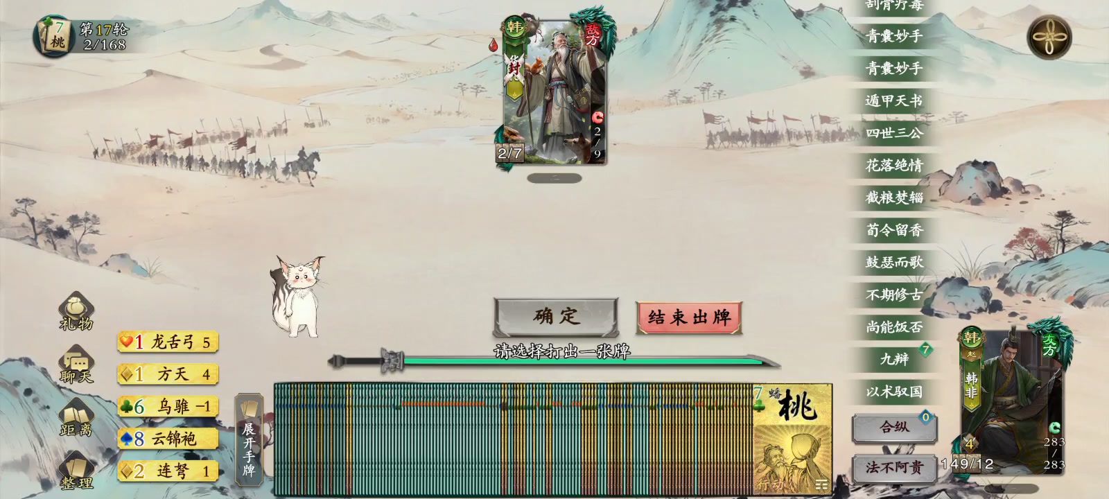 避雷!!!千里单骑、太平要术技能bug 干里单骑、太平要术有bug。只录到了后面部分。因为已经把牌堆摸光了,所以只要再摸牌, 就全是浮水。第一次有呼风唤雨之后,第二局又重新结算叠加了,导致异常,直接就算退出失败了。结果重启游戏之后,又继续新一局。新一局之后,又回到失败界面,重新开始。哎,白打了那么长一局。