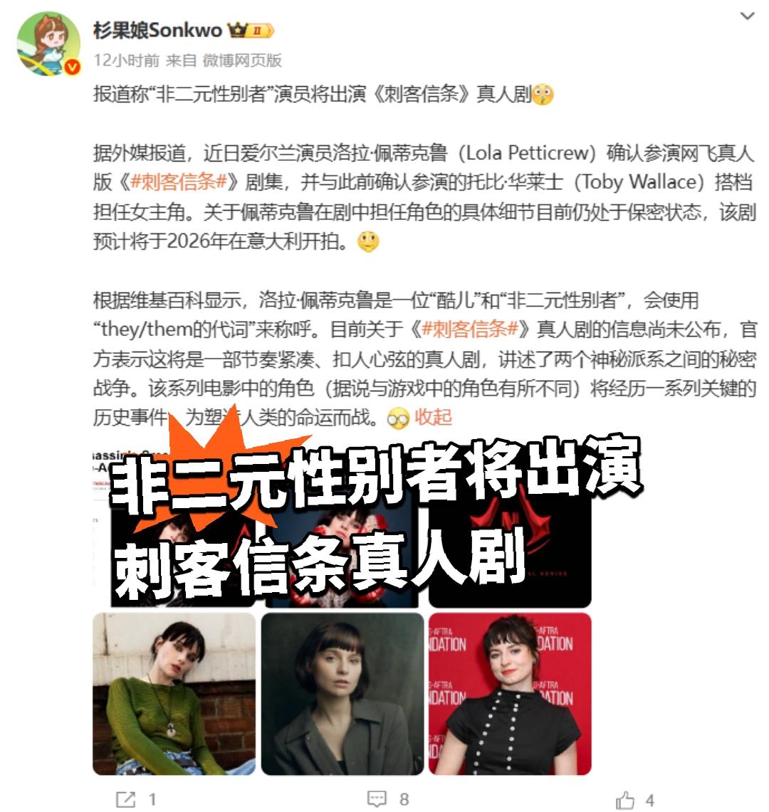 刺客信条游戏改编真人剧,然而 非二元性别者将出演刺客信条真人剧 这一信息以及相关话题,引发了网友们的大量讨论。演员看起来不错,但是一想到这人是非二元性别者,就感觉索然无味了#主机单机 #游戏资讯 #刺客信条