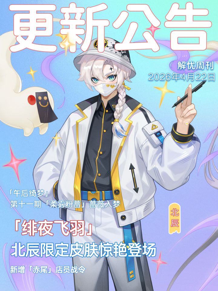 亲爱的店长:我们将于4月23日进行停服更新!停更时间为:2026年4月23日下午14:30-18:30版本亮点抢先看:1.「流光织影」北辰限定皮肤惊艳登场~(5月1日~5月10日,开服>=9天)2. 新增「赤尾」店员战令(拥有店员赤尾解锁)3.「午后绮梦」第十一期「柔雾粉蔷」蔷薇入梦4.「漫游手记」全新关卡拓展,故事延续5.「鲨乐时光」踏浪向前,