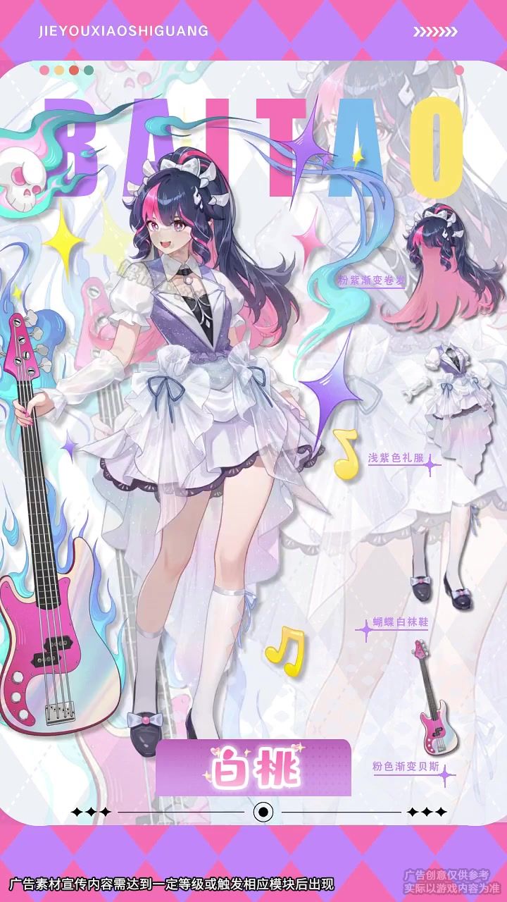 白桃全新皮肤已正式加入游戏!店长可通过活动「流光织影」抽取获得。 造型亮点:渐变高马尾利落而不失活泼,有着闪纱拖尾的浅紫色礼服更显飘逸灵动~带上白桃的专属乐器!骨灵精怪的表演要开始喽~ 换上这身礼服!现在是属于白桃的摇滚时刻! #发现好游戏 #模拟经营 #解忧小食光 #休闲游戏