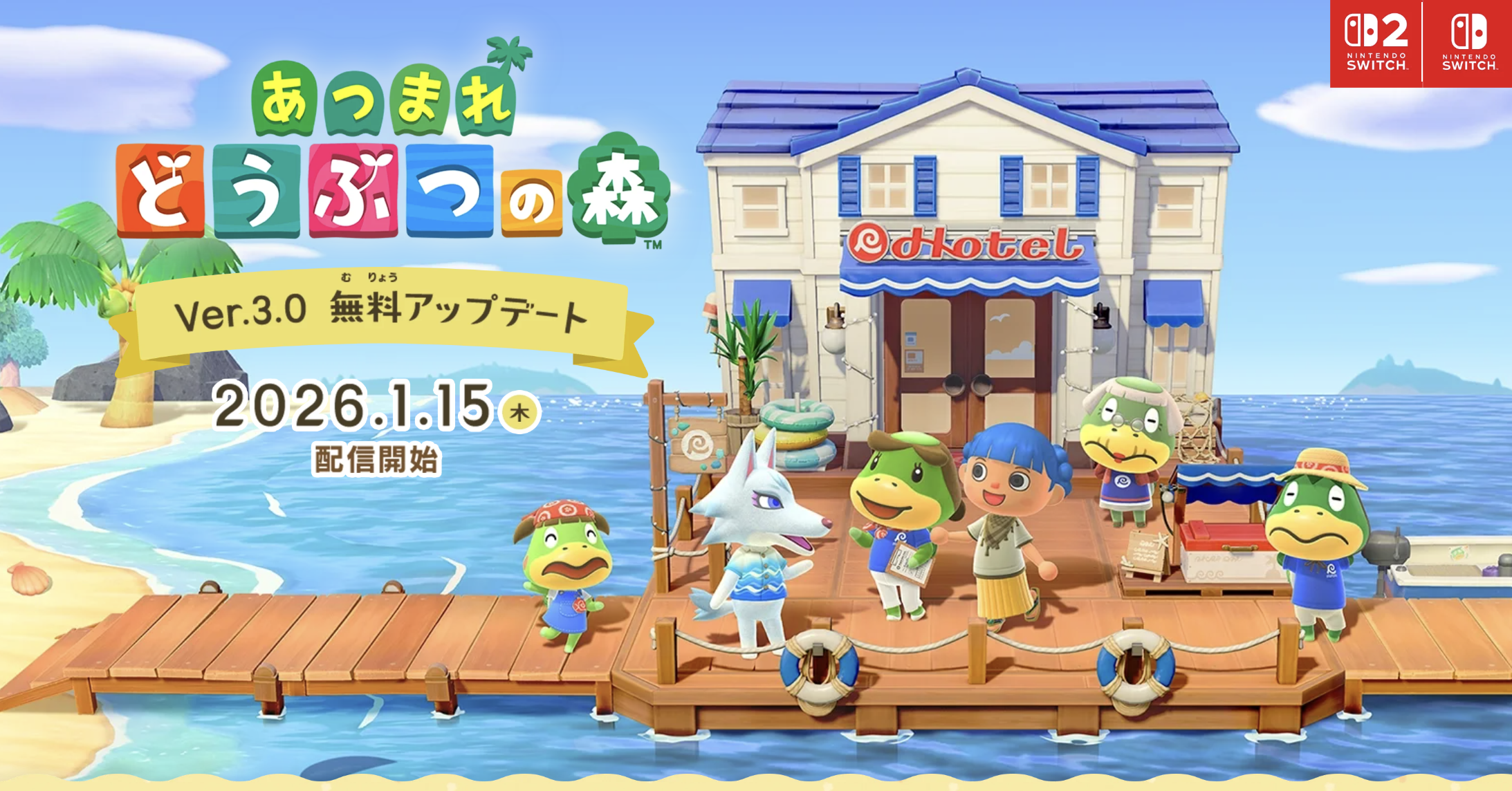 一觉醒来《集合啦!动物森友会》竟然预告更新了! 2026年1月15日,《集合啦!动物森友会》会推出一个NS 2的版本,升级通行证550日元;也会推出Ver.3.0免费大更新,更新也支持NS 1! 【更新1 度假酒店】 你的岛上将会建一座度假酒店,打造独具特色的客房吧! 入住酒店的客人可以在你的岛上自由漫步,动物和你的玩家朋友可以穿上你提供的衣服。 亲手制作岛屿特产并装箱,把它们运出岛外! 【更新2