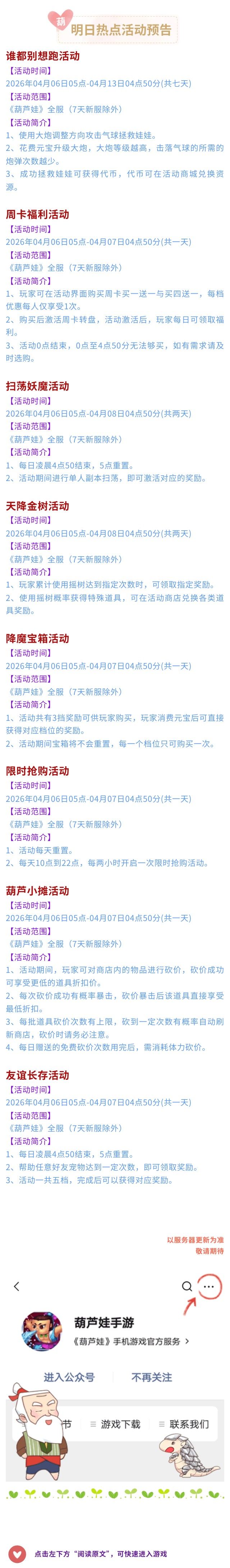 【葫芦娃】4月6日活动预告