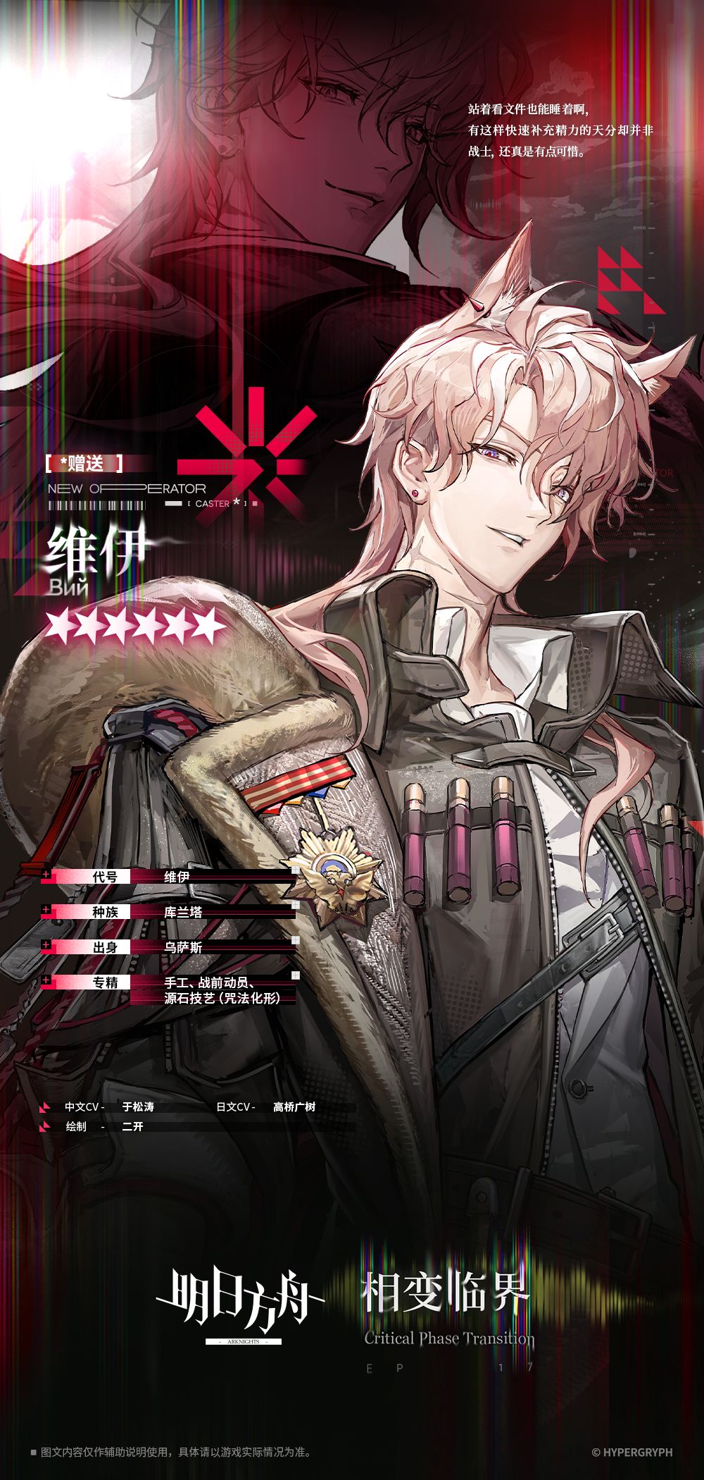 【活动奖励干员】 //维伊 “哦,兜帽,遮住全身的衣袍。你也有想隐藏的过去?没关系,我理解。斯乔帕·拉辛,为与你们建立合作关系而来,和队里那些家伙一样,叫我‘维伊’就行。” __________________ “......‘不是无人的苦路,也不是杀伐的险路。’” “‘而是,通往自由的道路!’” “乌拉!” “老祖母在上,现在,我们出发!” “乌拉——!” 欢呼之后,穿着相同制服的库兰塔们和埃拉
