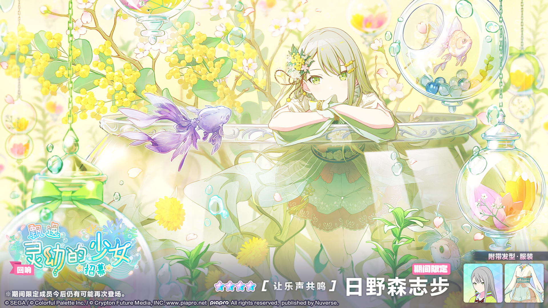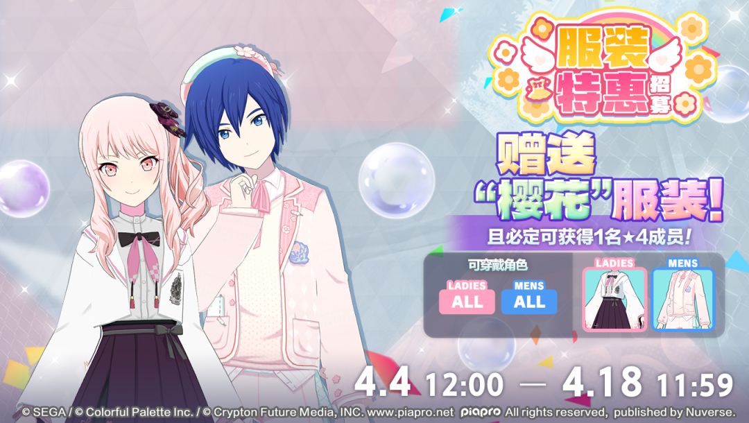 尊敬的各位「世界」居民: 我们将于4/4 12:00起举办「“樱花”服装特惠招募」! 在“樱花”服装特惠招募”中必定出现★2及以上成员,且必定出现1名★4成员。 另外,会给予“樱花”主题服装“绸音樱舞”、“樱花夹克”。 出现的★4成员为截止至2025年12月21日在招募中已登场的成员。 【举办时间】 4/4 12:00 ~ 4/18 11:59 ※详情请至游戏内通知查看。 今后也请多多支持《初音