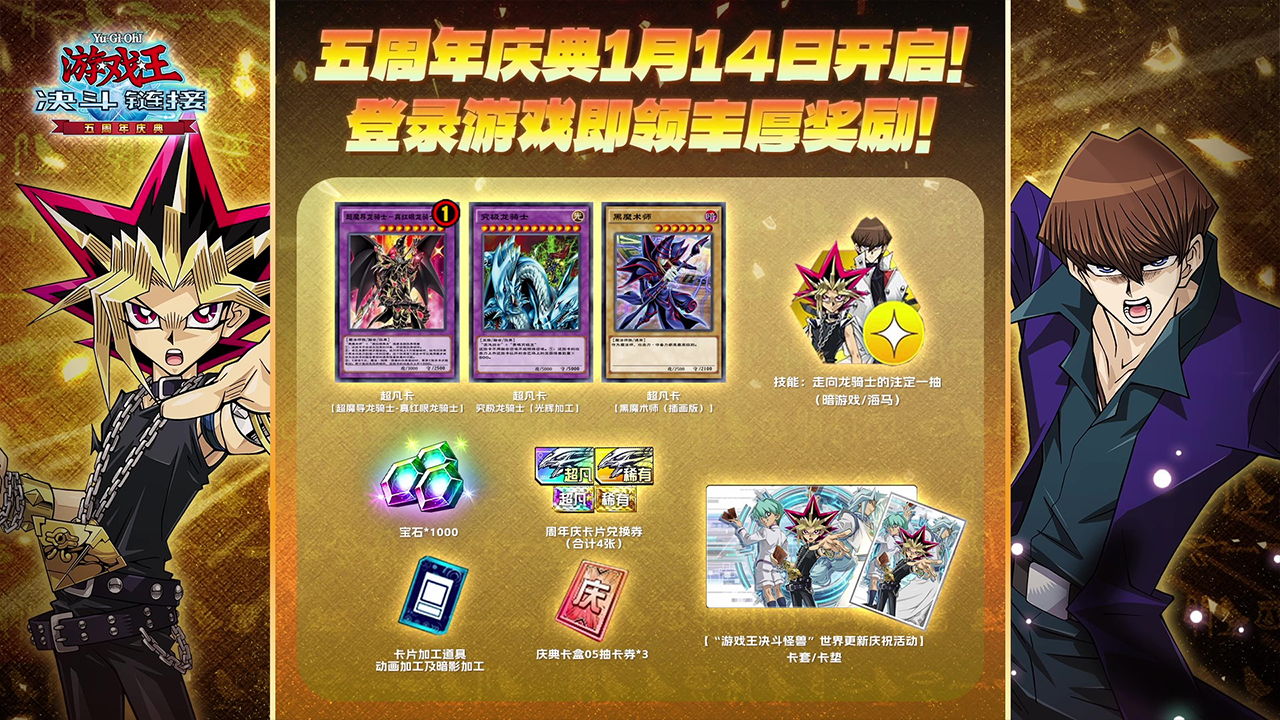 国服专属技能“破坏剑的觉醒”实装纪念!登录即可获得技能及异画卡奖励!活动期间登录游戏,即可获得豪华奖励! 【活动时间】2024-12-13 10:00:00 至 2025-01-12 9:59:59 【登录奖励】黑魔术师(特殊插画版本-镜碎)、超魔导剑士-黑暗帕拉丁(特殊插画版本-镜碎)、破坏之剑士(面闪)、技能-破坏剑的觉醒 技能“破坏剑的觉醒”:决斗开始时,将一张“破坏剑的追忆”送入墓地。 ※