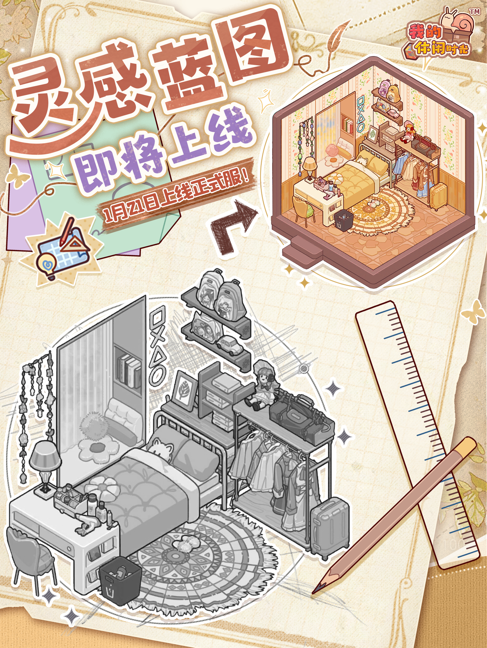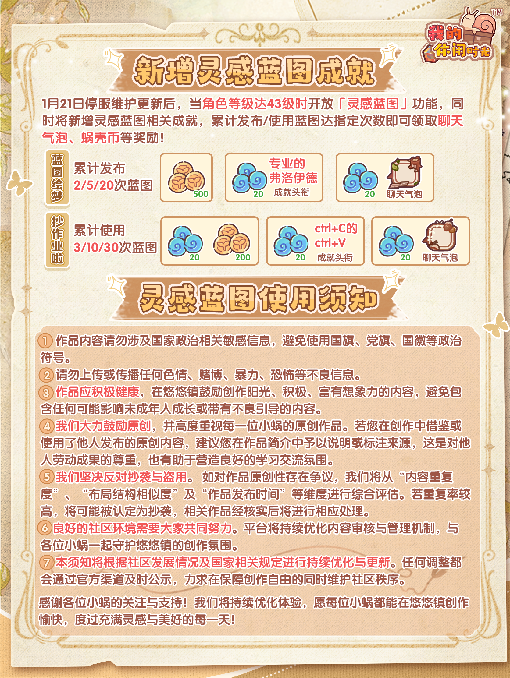 悠悠镇头条速递—— 是什么让装修小白半天化身装修大佬?! 空空如也的房间10秒“平地起高楼”的秘密是什么?! 原来这一切都是因为:「灵感蓝图」要上线啦! 💡全新功能「灵感蓝图」将于1月21日停服维护结束后上线正式服! 【当角色等级≥43级时】即可开启「灵感蓝图」功能,小蜗可以在灵感蓝图中上传自己的装修方案为其他小蜗提供设计灵感,还能寻找心仪的装修方案进行一键翻录,助你一键打造理想屋! 本次上线后,