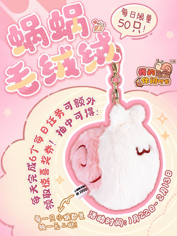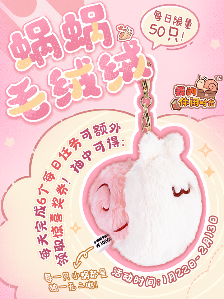 自第一批毛绒挂件陆续到达各自小蜗手中后,居居瞧见了不少晒图 许多没拿到的小蜗纷纷表示:“好萌!我也想要!” 于是居居决定:「蜗蜗毛绒绒」限时抽奖再次开启! 前方一大批超萌的毛绒小蜗挂件即将到达你的怀中~ 🎁「蜗蜗毛绒绒」限时抽奖活动即将开启!1月22日10:00-2月13日23:59期间,每天完成6个每日任务即可额外领取一张「惊喜奖券」,使用惊喜奖券进行抽奖即有机会获得每日限量50只的「毛绒小蜗实