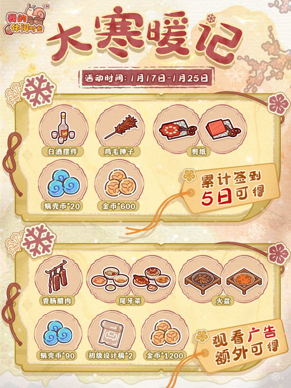 大寒,作为二十四节气中的终章,寒意虽深,但在此后冬色渐融,万物开始期盼春的归来~「大寒暖记」限时签到即将开启!完成签到即可获得限定家具,一起暖融融地过大寒吧~ ⭐️活动时间⭐️ 1月17日10:00-1月25日23:59 ⭐️活动形式⭐️ 活动期间,累计完成5日签到即可免费获得限定家具「白酒摆件」、「鸡毛掸子」、「剪纸」及蜗壳币等奖励,观看广告还可额外免费获得更多限定家具「香肠腊肉」、「尾牙菜」、