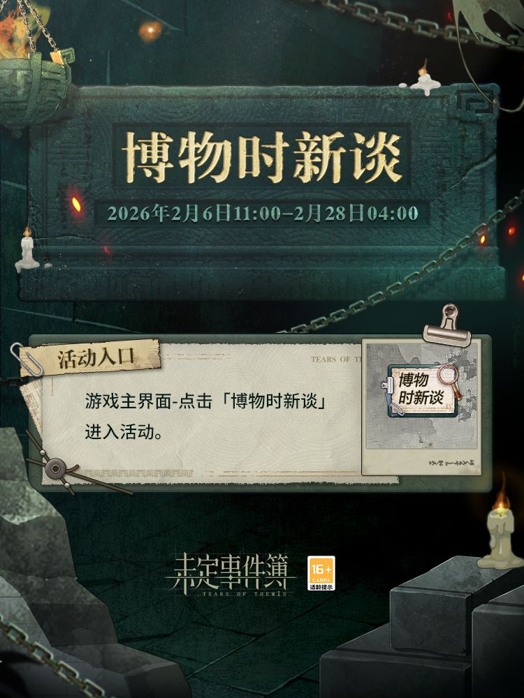 拂尘启匣,共话时新。 2026年2月6日11:00,「博物时新谈」限时活动开启! ✨「博物时新谈」限时活动预告 ▶活动时间:2026年2月6日11:00-2月28日04:00 活动期间,律师可通过点击屏幕获取抵达的「秘闻」,「秘闻」中隐藏着关于「故城长燃的薪火」活动的背景信息。解锁「秘闻」即可点击领取【未名晶片】、思绪进化素材等奖励。