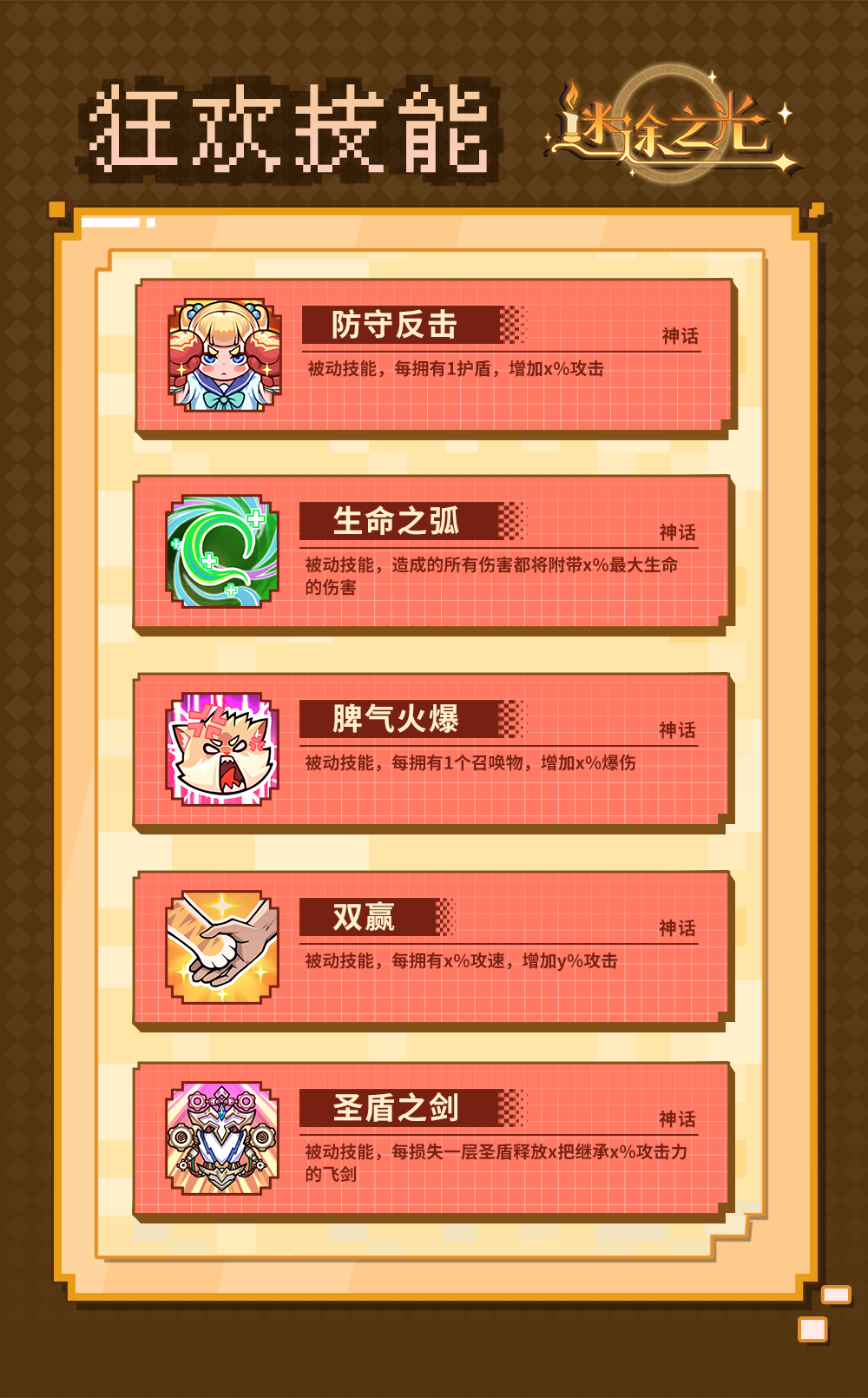 各位冒险家好呀! 这里是最最可爱的龙樱~ 给大家带来四月狂欢技能图鉴~ 狂欢技能 四月将新增⌈熟能生巧⌋、⌈彻底疯狂⌋、⌈猫爷⌋、⌈攻防一体⌋、⌈圣盾之灵⌋5个全新狂欢技能 三月狂欢技能⌈百川汇流⌋、⌈无损状态⌋、⌈万物有灵⌋、⌈祭剑⌋、⌈专攻⌋将移出狂欢技能池 ps:通关19-1解锁狂欢技能~ NEXT 我要验牌~给我擦皮鞋! ps:红字为密令,游戏内点击【右上角-密令】即可兑换~