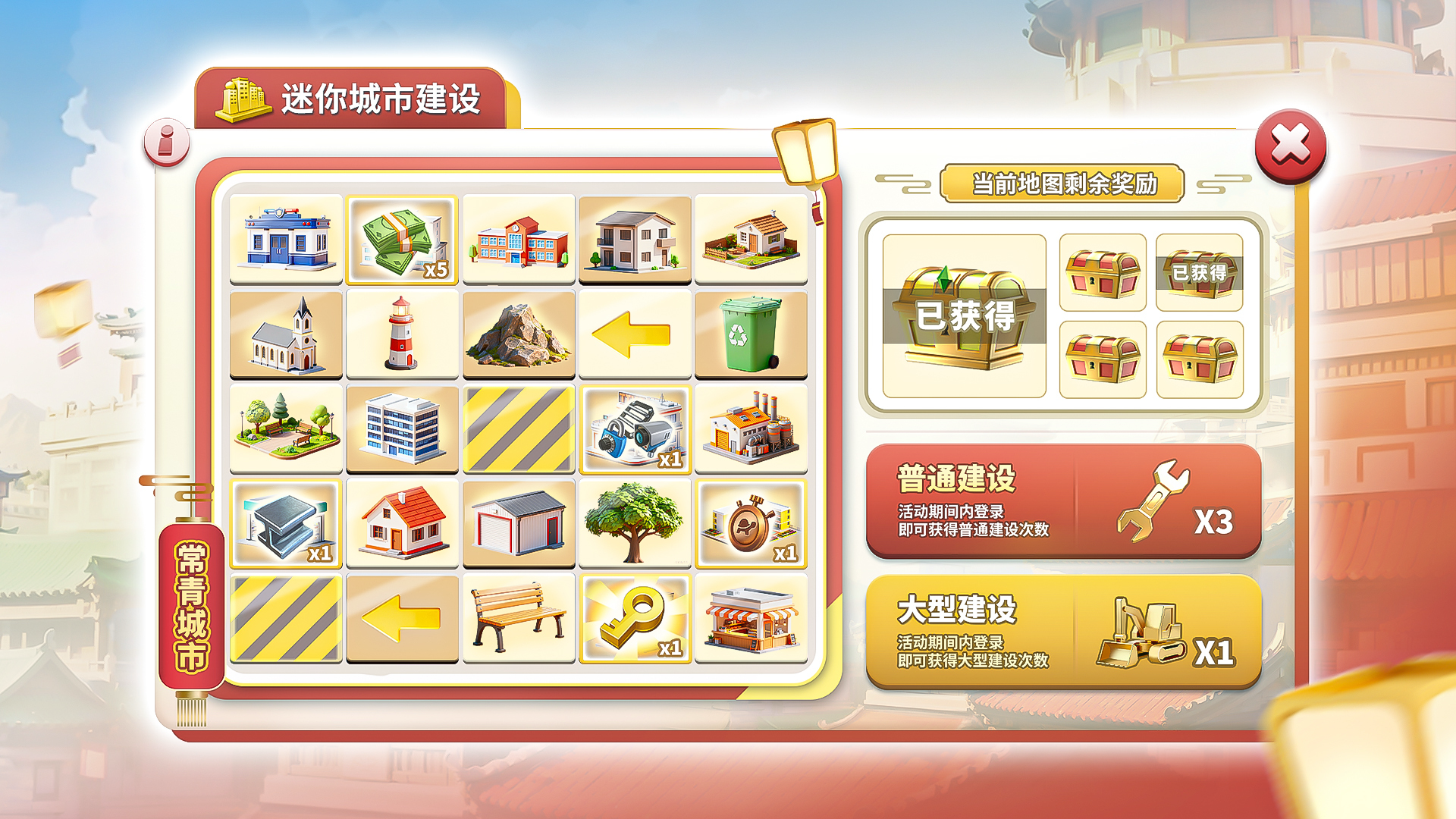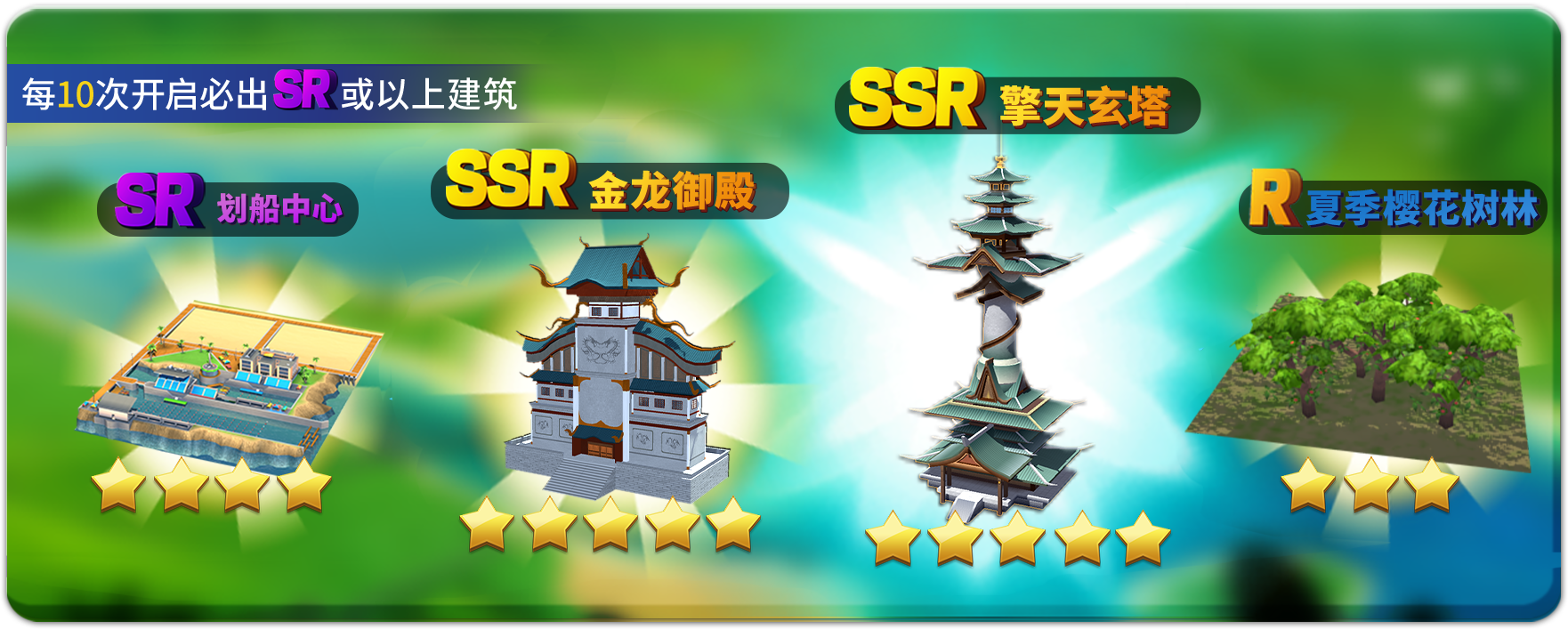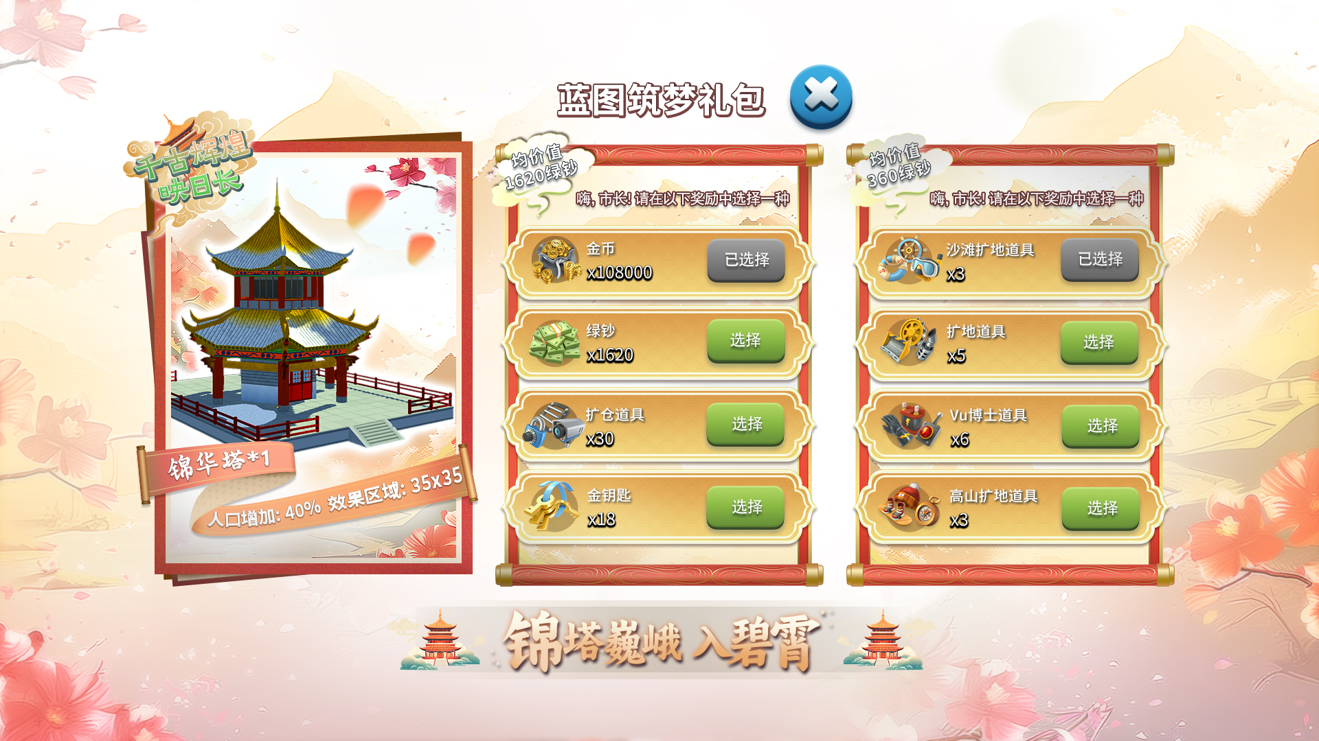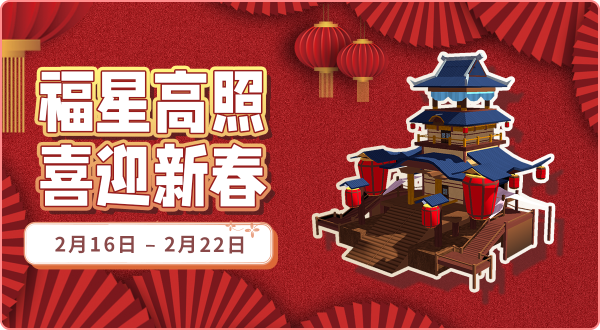 完成迷你城建,收获惊喜更有建筑大奖青瓷轩等你拿;全国风赛季骏马迎春开启;锦华塔加入限时豪华套餐礼包;建筑盲盒金龙御殿、擎天玄塔限时开放抽取。