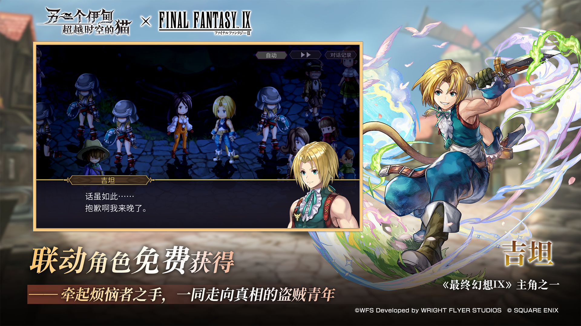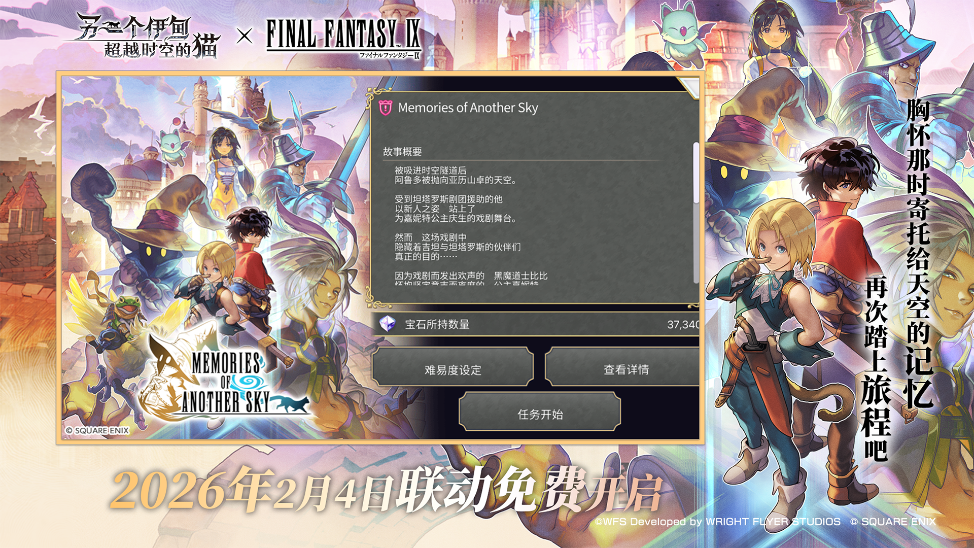 大家好,这里是菲奈! 《另一个伊甸》×《最终幻想Ⅸ》的联动活动将于2月4日拉开帷幕! 冒险时间已定,大家准备好了吗!联动协奏故事「Memories of Another Sky」也在PV中亮相! 【故事大纲】 被吸进时空隧道后 阿鲁多被抛向亚历山卓的天空。 受到坦塔罗斯剧团援助的他 以新人之姿 站上了 为嘉妮特公主庆生的戏剧舞台。 然而 这场戏剧中 隐藏着吉坦与坦塔罗斯的伙伴们 真正的目的…… 因