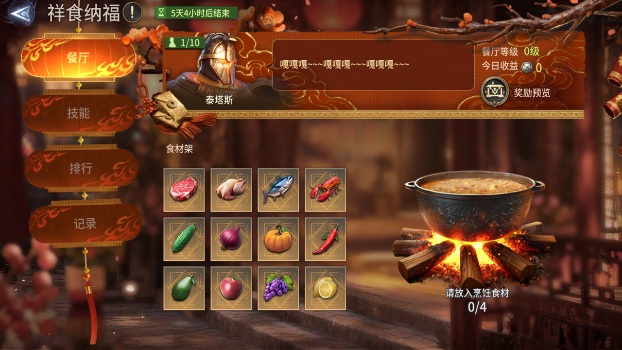 活动时间:2026年04月05日 00:00:00 - 2026年04月08日 23:59:59 参与条件:通关普通战役N1-9 活动说明:在本期惊喜神圣召唤卡池中,首次获得5星传说英雄时,可额外随机获得一名5星传说英雄。额外获得传说英雄的机制在活动期间仅会在惊喜神圣召唤中生效1次。