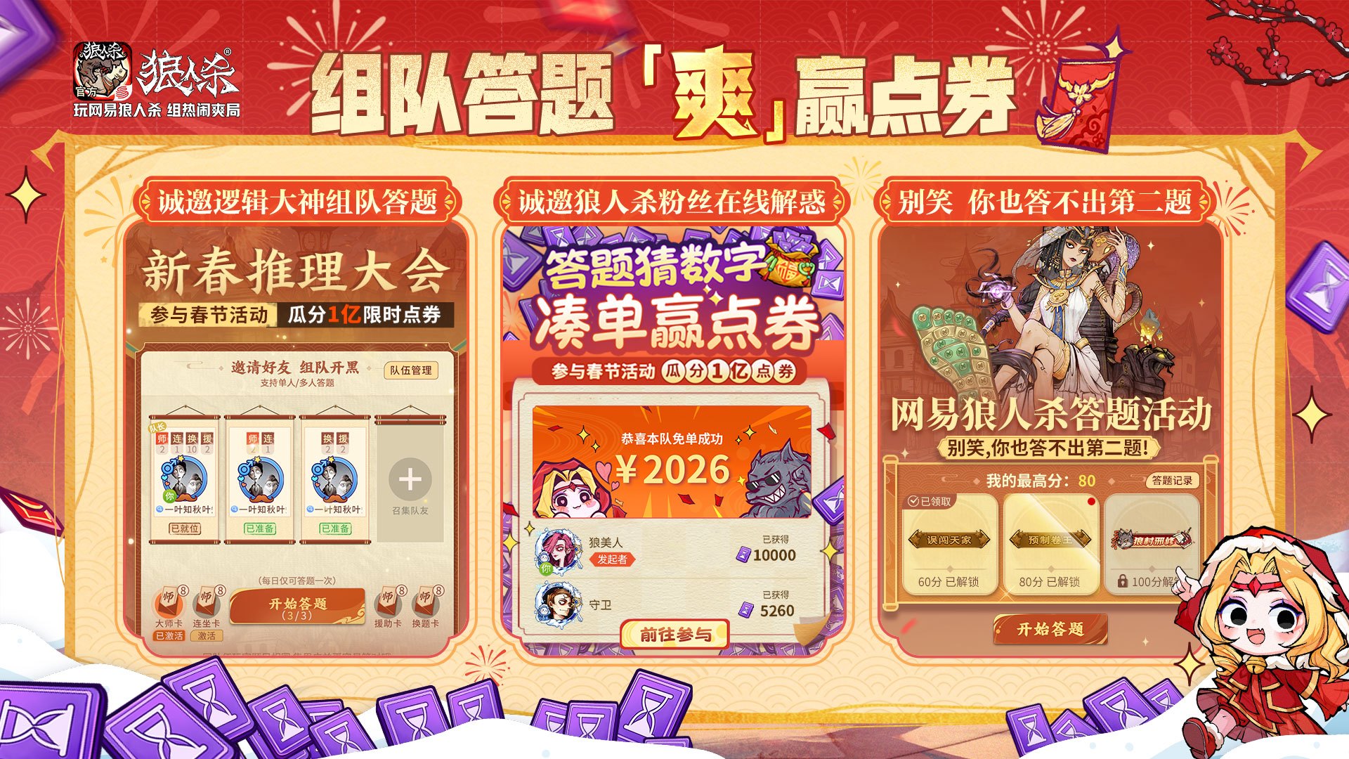 网易狼人杀春节活动“玩热闹爽局,瓜分1亿点券”开启!2月10日至3月6日期间,推出连连看等娱乐玩法,参与集福卡、推理大会等活动可瓜分点券奖励