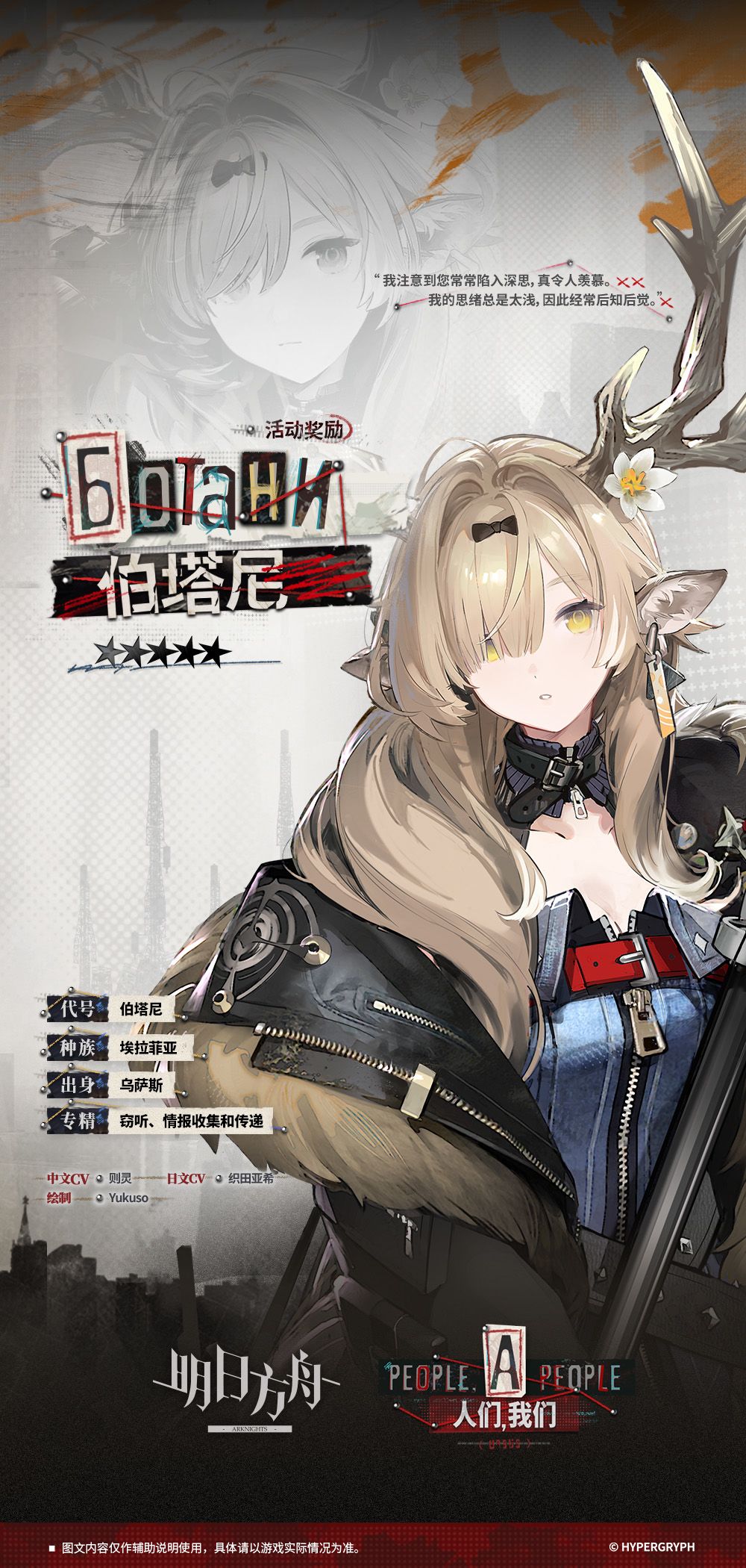 【活动奖励干员】 //伯塔尼 “博士,我记得您,罗德岛加密信号里那个高频出现的特殊波形。您叫我伯塔尼就好,我习惯了别人这样叫我。‘书呆子’,我将它理解为一种夸奖。” __________________ .-- ... . -- / -.- - --- / ... .-.. -.-- ---- .. - // --. .-. .. ..-. . -. -... ..- .-. --. / -.-