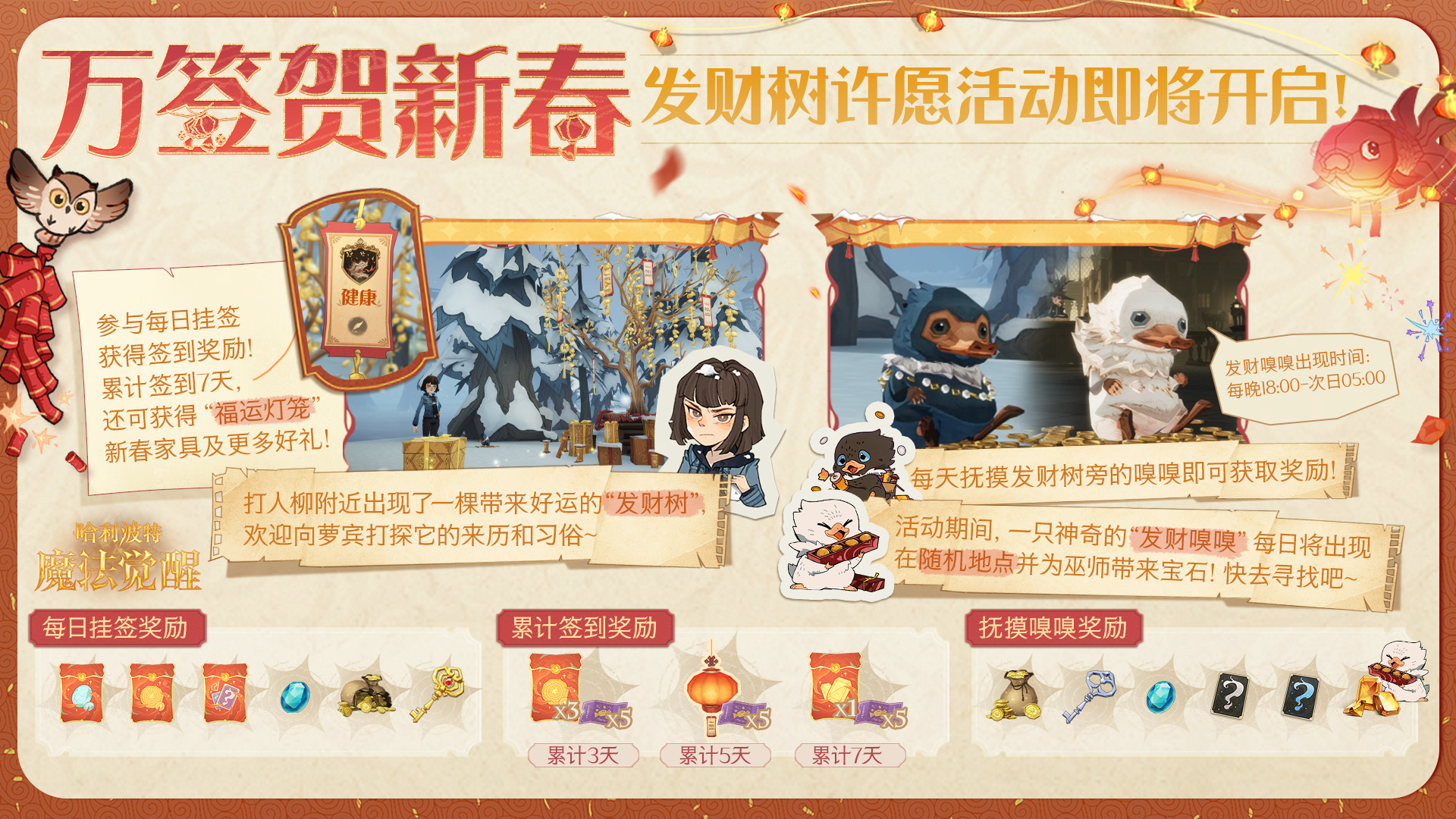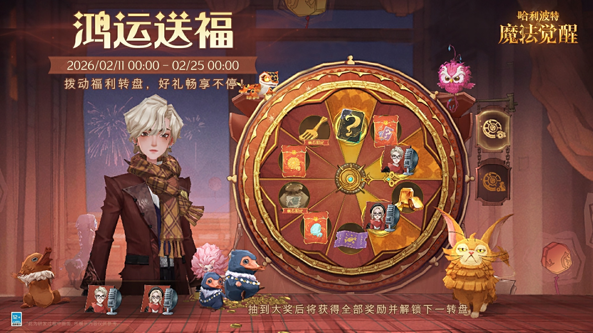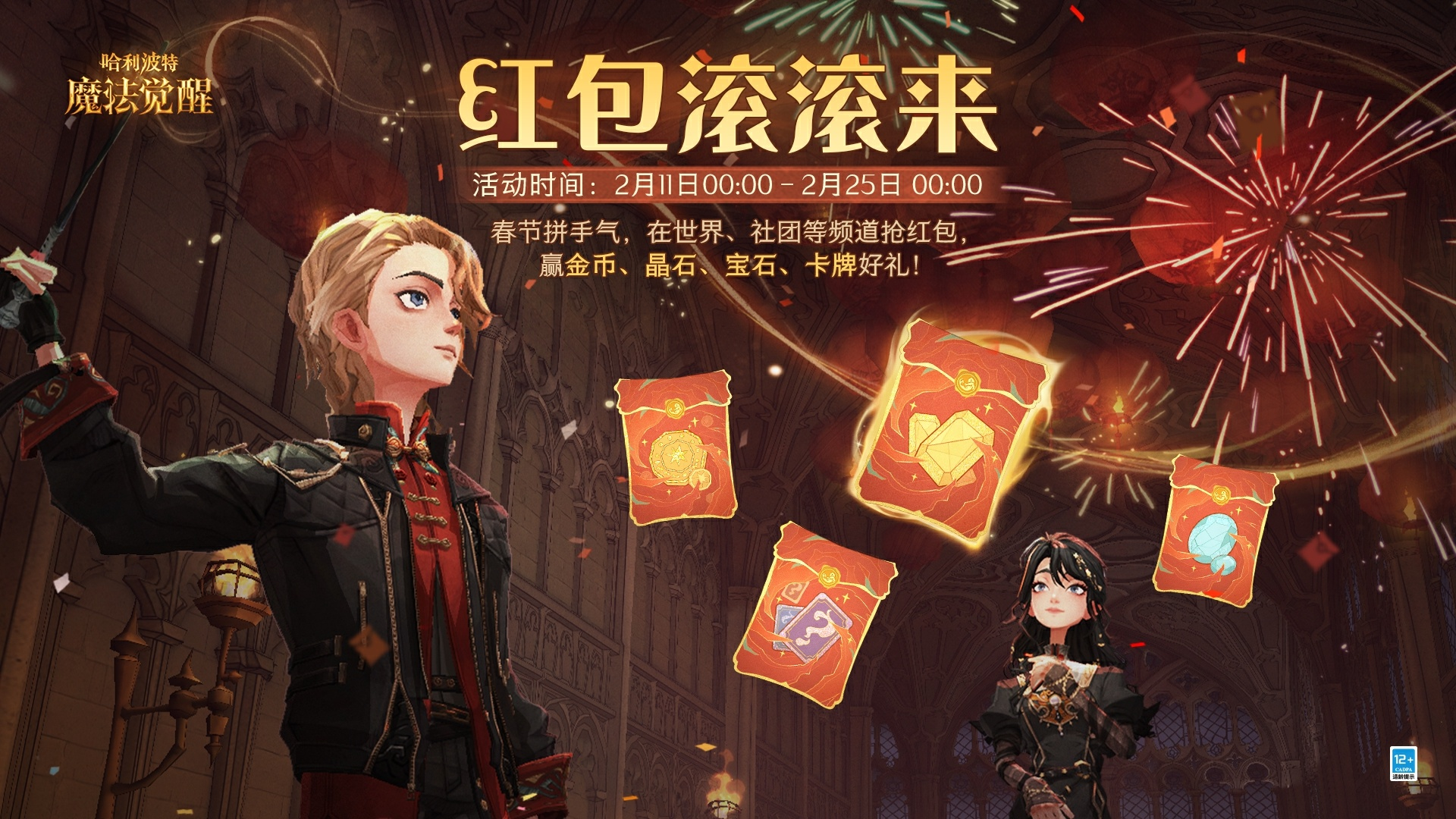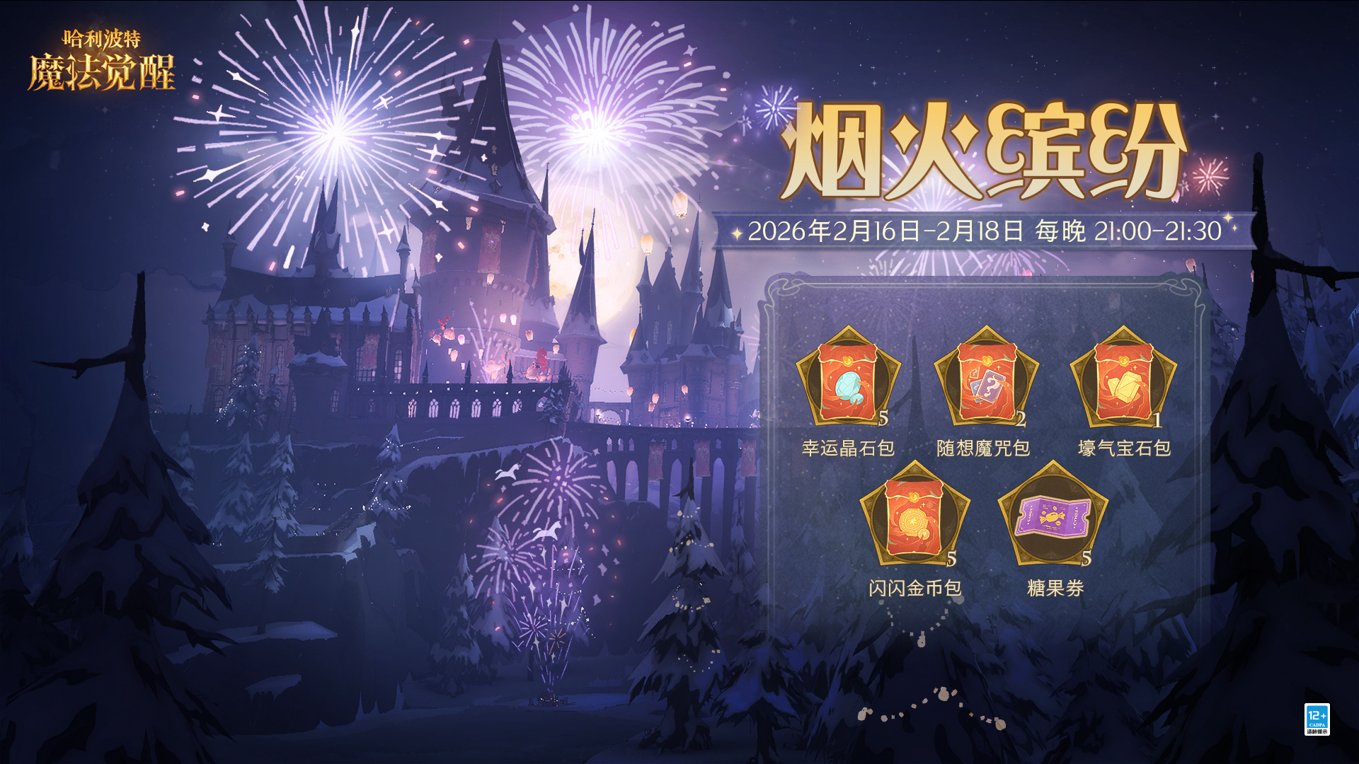 亲爱的小巫师们 霍格沃茨城堡的跨年烟花秀即将开启 烟火璀璨 点亮夜空 陪你迎接魔法满满的新一年! ✦「烟火缤纷」跨年烟花秀 ✦ ✦活动时间: 2024年12月31日20:00 - 2025年1月1日2:00 ✦惊喜好礼: 每观赏60秒烟花秀,即可解锁1个彩蛋奖励,最多累计可领取5次!只需站定5分钟,即可将以下奖励全部收入囊中: 「宝石」*188 「金币」*8888 「金耀之匙」*2 「焰色之锁」*