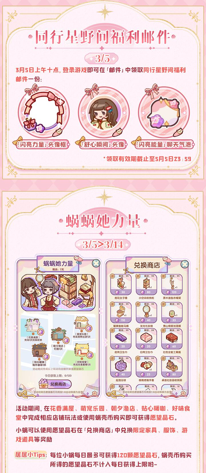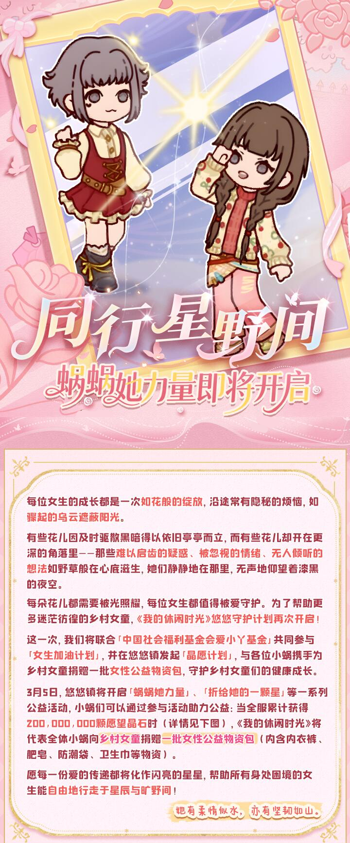 我们生长在同一片天空下,我们拥有着相似的花期。 然而,并非每一朵花的绽放都能得到关注与叮咛,有那么一些女孩在懵懂无助中迎来成长的初潮。这一次,我们将翻越山野,用爱守护她们的健康成长~ 为了帮助更多迷茫彷徨的乡村女童,《我的休闲时光》将携手「中国社会福利基金会」「爱小丫基金」在悠悠镇开展「同行星野间」公益联动活动! 3月5日,「蜗蜗她力量」限时活动正式开启,完成地图店铺相应玩法即可获得愿望晶石助力公