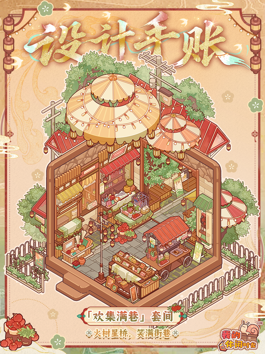 ⭐️设计关键词:街景、日常 吃饱喝足没事做,不如一起出门逛逛吧! 我保证,这次绝对只看不买! 滋滋冒油、香气四溢的烤肉串?这个得吃,错过烤得那么好的烤肉就错过了! 追的小说和漫画更新了?这个得看,早晚都要看的不如就今晚看了! ……嗯?为什么才逛了一半我的钱包就瘪瘪的啦? 🏮全新限时套间「欢集满巷」即将于3月4日上线!今天先为各位小蜗带来「欢集满巷」套间的设计手帐,快跟居居一起近距离欣赏套间细节吧~