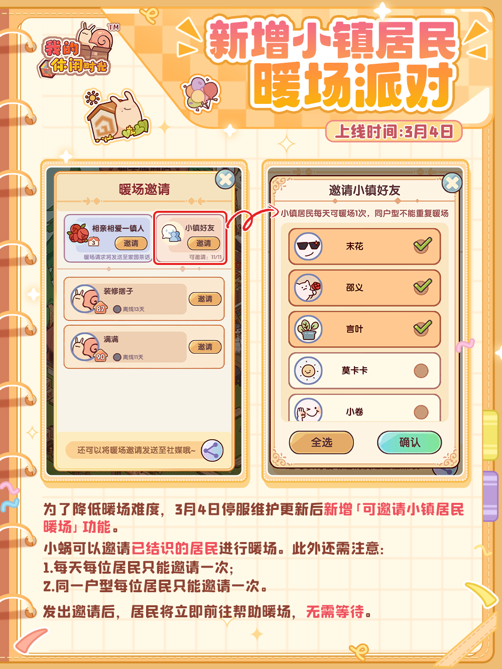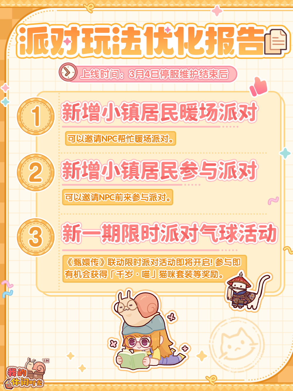 “想开派对!但本i蜗找不到那么多好友怎么办!” “本e蜗也求好友!最好再来56789个好友!每场派对都热热闹闹的才好!” ——那么,要不试试邀请悠悠镇的“他们”一起来参加派对呢? ⭐️3月4日10:00-3月17日23:59期间,「派对」玩法开启!这次还将伴随着新增全新的功能与活动上线,快来一起看看吧~ 🎉省流版优化汇总: ⭐️可以邀请小镇居民暖场派对。无需等待,即刻暖场! ⭐️可以邀请小镇居民参