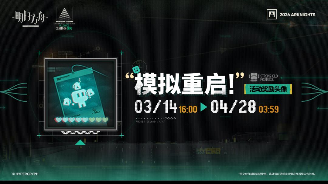 【活动奖励头像】 //“模拟重启!” 选好装备,定下策略,整编队伍,再次进发! _____________ 活动奖励头像“模拟重启!”,「卫戍协议:盟约」限时活动提升【功勋兑换处】等级获取 【功勋兑换处】开放时间:3月14日 16:00 - 4月28日 03:59 ◆03月14日16:00 - 17:00将开启服务器停机维护,「卫戍协议:盟约」将在维护后开启,活动开启时间存在提前或延迟的可能,详情