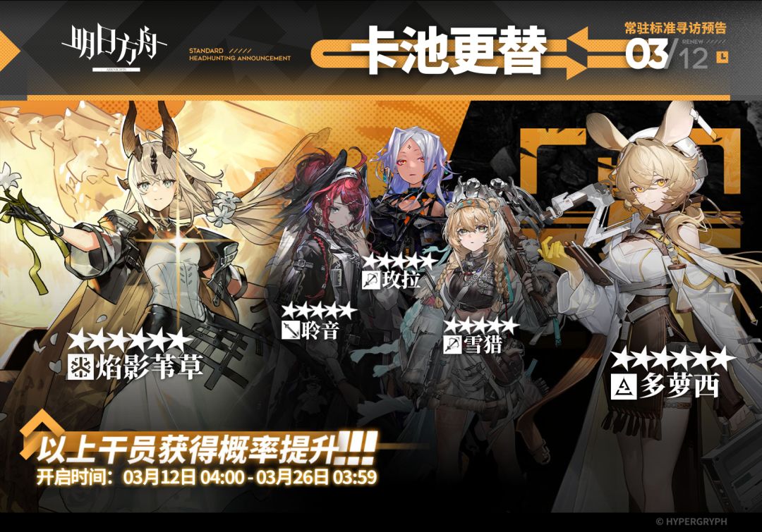 【常驻标准寻访】 起止时间:3月12日04:00 ~ 3月26日03:59 寻访说明:常驻标准寻访更新,该寻访中以下干员获得概率提升; ★★★★★★:焰影苇草 / 多萝西(占6★出率的50%) ★★★★★:聆音 / 玫拉 / 雪猎(占5★出率的50%) *本次寻访期间,以下干员可于凭证交易所内使用高级凭证兑换:多萝西、玫拉 更多后续活动内容及最新消息请关注《明日方舟》游戏内公告,感谢大家的支持