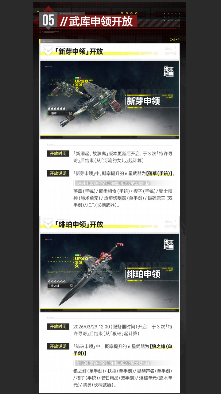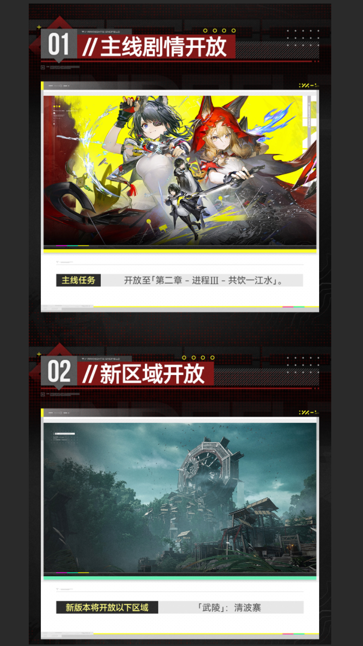 全新主线任务更新,新区域「首墩」「试验园区」依次开放,6星干员【庄方宜】获取概率提升!更多活动及玩法内容请关注官方公告。