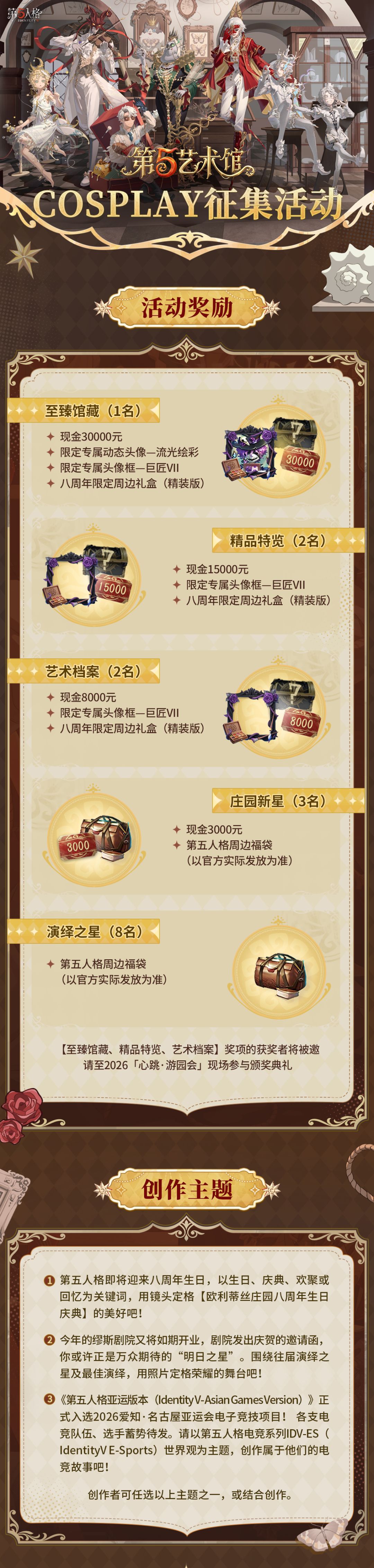 第七届第五艺术馆同人创作大赛今日开启! 【活动时间】 征集时间:3月31日12时-5月10日24时 投票时间:5月14日12时-5月28日12时 评审时间:5月14日-6月1日 结果公布:6月8日后 【活动详情】 本次创作大赛共开启【同人文、同人插画、表情包、COSPLAY、同人音乐、同人手作】六大版块。欢迎各位访客选择心仪的板块和主题参与创作投稿。 本次创作大赛也配制了专属游戏道