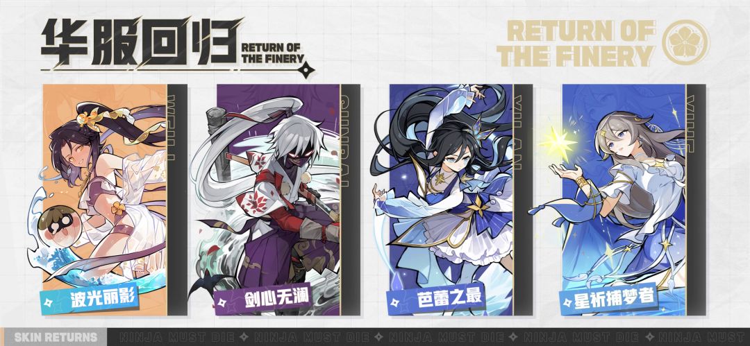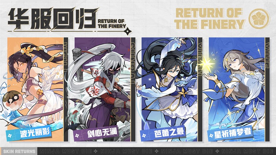 万物复苏,华服回归 本周四(3月12日)更新维护后 「华服回归」活动重返忍界 四款人气皮肤限时回归! >本次回归皮肤< 剑心·卫鲤:波光丽影 夜叉·隼白:剑心无澜 冰羽·兮兰:芭蕾之最 霜刃·伊鹤:星祈捕梦者 款式多样,风格各异!忍忍们快来get你的春日穿搭指南吧! 【四款皮肤展示】 活动期间,忍忍们可以选择所有未拥有的回归皮肤进行购买,购买回归皮肤会附赠对应的忍术特效、头像与对应忍者属性的纹石×