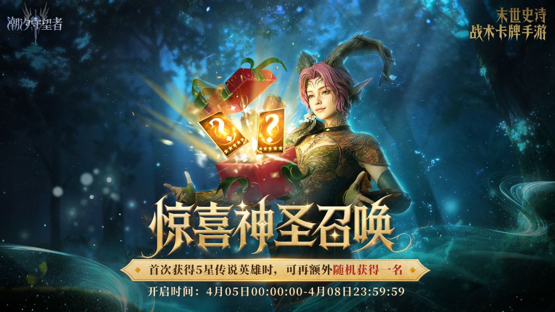 活动时间:2026年04月05日 00:00:00 - 2026年04月08日 23:59:59 参与条件:通关普通战役N1-9 活动说明:在本期惊喜神圣召唤卡池中,首次获得5星传说英雄时,可额外随机获得一名5星传说英雄。额外获得传说英雄的机制在活动期间仅会在惊喜神圣召唤中生效1次。