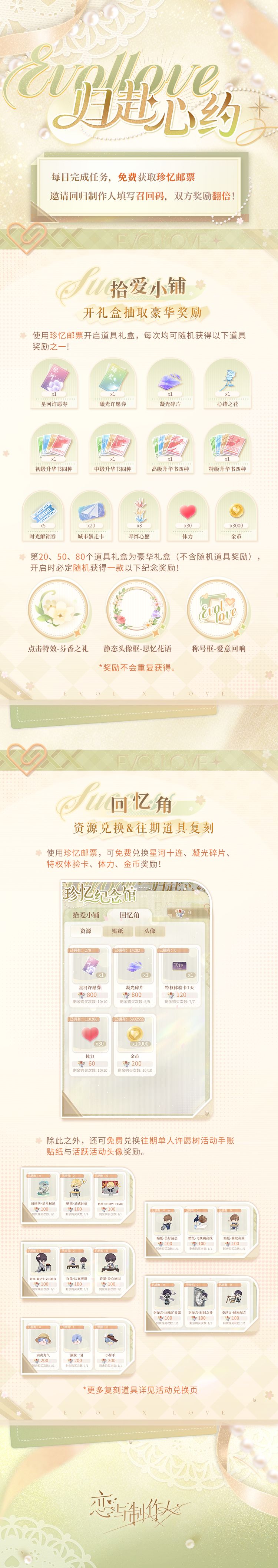 独乐乐不如众乐乐。召回好友,一起玩耍吧~! ⭐ 活动时间:3月22日更新后~4月21日23:59 ⭐ 完成任务:收集珍忆邮票 1.活动期间,所有制作人可前往主界面或【精彩活动】-【归赴心约】参与活动。 2.每日完成活动任务,均可获得【珍忆邮票】。 ⭐ 召回有礼:珍忆邮票奖励翻倍 1.活动期间,可在活动界面中可以查看并对外分享你的【专属召回码】,邀请【2026年2月24日5:00后未再登录过游戏,且