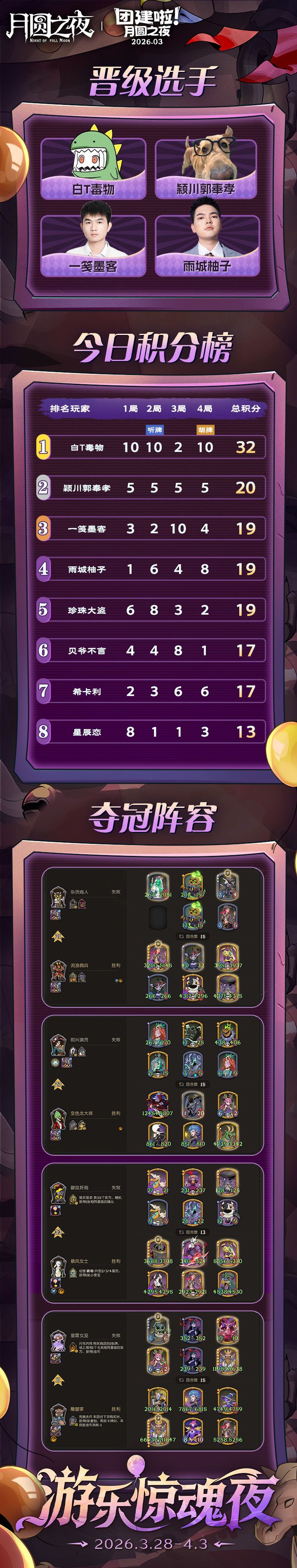 🎉恭喜白T毒物、颍川郭奉孝、一笺墨客、雨城柚子 四位选手成功晋级! 全场最佳 白T毒物 连吃2鸡率先听牌,并在第4局再吃1鸡结束比赛! 新赛季怎么玩,速速👇戳长图学习夺冠阵容 🗓️ 明天19:00,继续锁定月圆之夜官方直播间收看精彩比赛! #月圆之夜s11 ##月圆之夜镜中对决 ##卡牌游戏 #