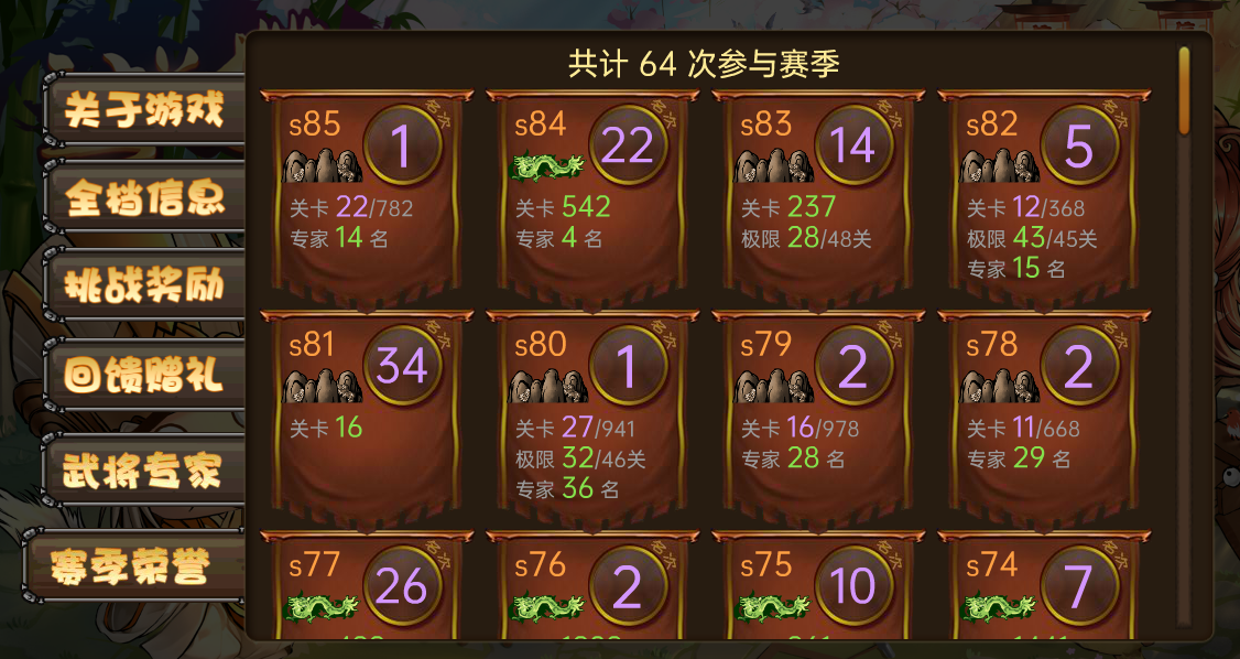 这次版本做了一个调整,巅峰和龙虎榜的兵符做了区别,因为现在4级兵符的数量越来越多了,要轮转1圈的周期会很长,现在相当于轮转速度会更快,也可以选择自己想争取的兵符,关于这个方案,帖子底部也做投票,大家觉得好可以长期适用这个新的方案。 这次还做了一个新的尝试,让官职的作用不仅仅影响战斗,也能有一些功能性的效果,比如这次新加"水军都督"的就有该作用,后面版本也计划一些类似的官职。 最新版本将在本月