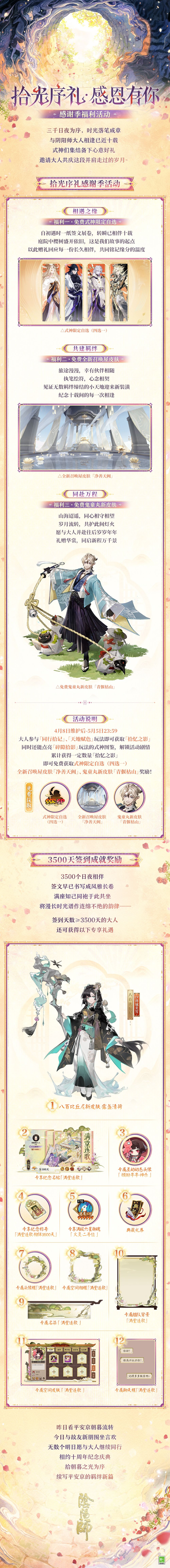 寒来暑往,白驹过隙,从平安京庭院中的初遇,到相伴近十载的岁岁相依,时光沉淀着彼此不可磨灭的羁绊。崽崽们特地倾献心意,备下十周年启幕好礼,邀大人共赴这场即将到来的十周年之约—— △ 拾光序礼感谢季活动 ※4月8日维护后-5月5日23:59,大人参与「同行拾记」、「天地赋色」玩法即可获取「拾忆之影」,同时还能点亮「碎隙拾影」玩法的式神图鉴,解锁活动剧情与特别邮件。 ※累计获得一定数量「拾忆之影」,即可