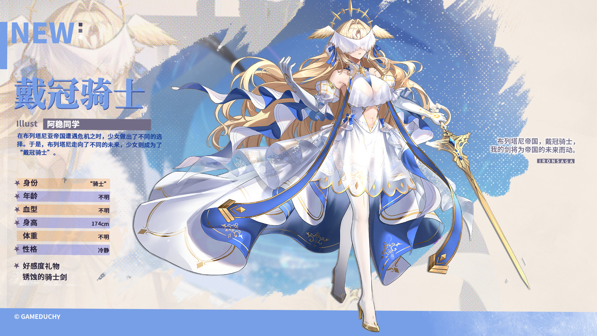 铁公爵”威灵顿家族代代相传的古老机体,曾经作为“亚瑟王”的验证机。在数百年前的大战之后,一直沉睡在威灵顿家族的陈列室中,只有当代的家主才知道,它不只是件华美的装饰。 据说,被她选中的机师才能解放她真正的力量。当她拔出背后的“选王之剑”,那美丽、强大的姿态将会让战友与敌人理解何为“骑士之道”。