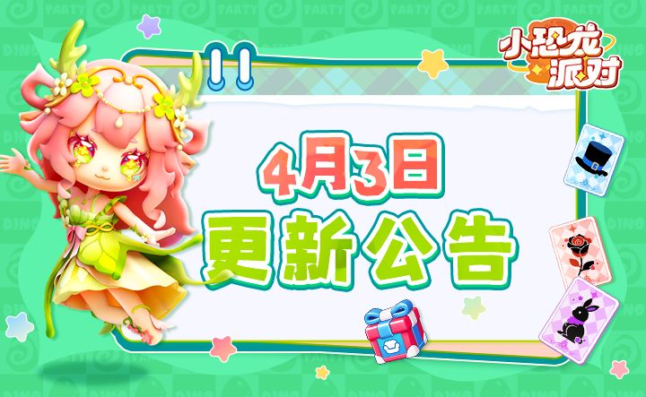 亲爱的龙宝: 为持续优化游戏体验,《小恐龙派对》即将进行停服更新。更新期间将临时封岛,请提前规划游戏时间,避免造成损失 📅 更新时间: 4月3日 23:00- 4月3日 23:30 (视实际情况可能有所提前或顺延) 🌟更新内容 1、花园商店价格调优 花园物价优化: 下调花园种子商店、工具商店、宠物商店&礼包商城内物品的紫水晶购买价格; 扩容门槛降低: 下调宠物栏位、地块、售卖摊和宠物箩筐的扩容解
