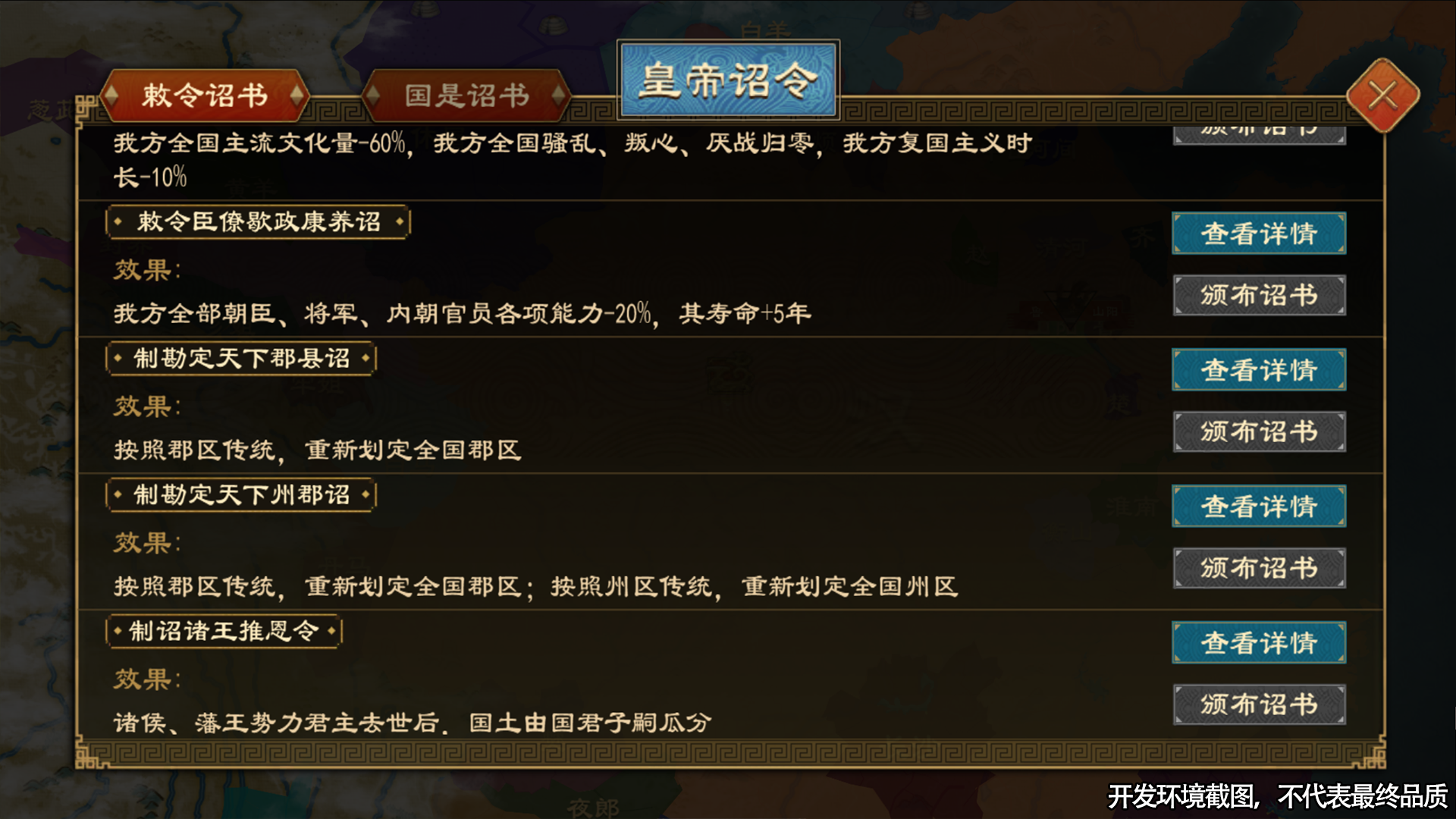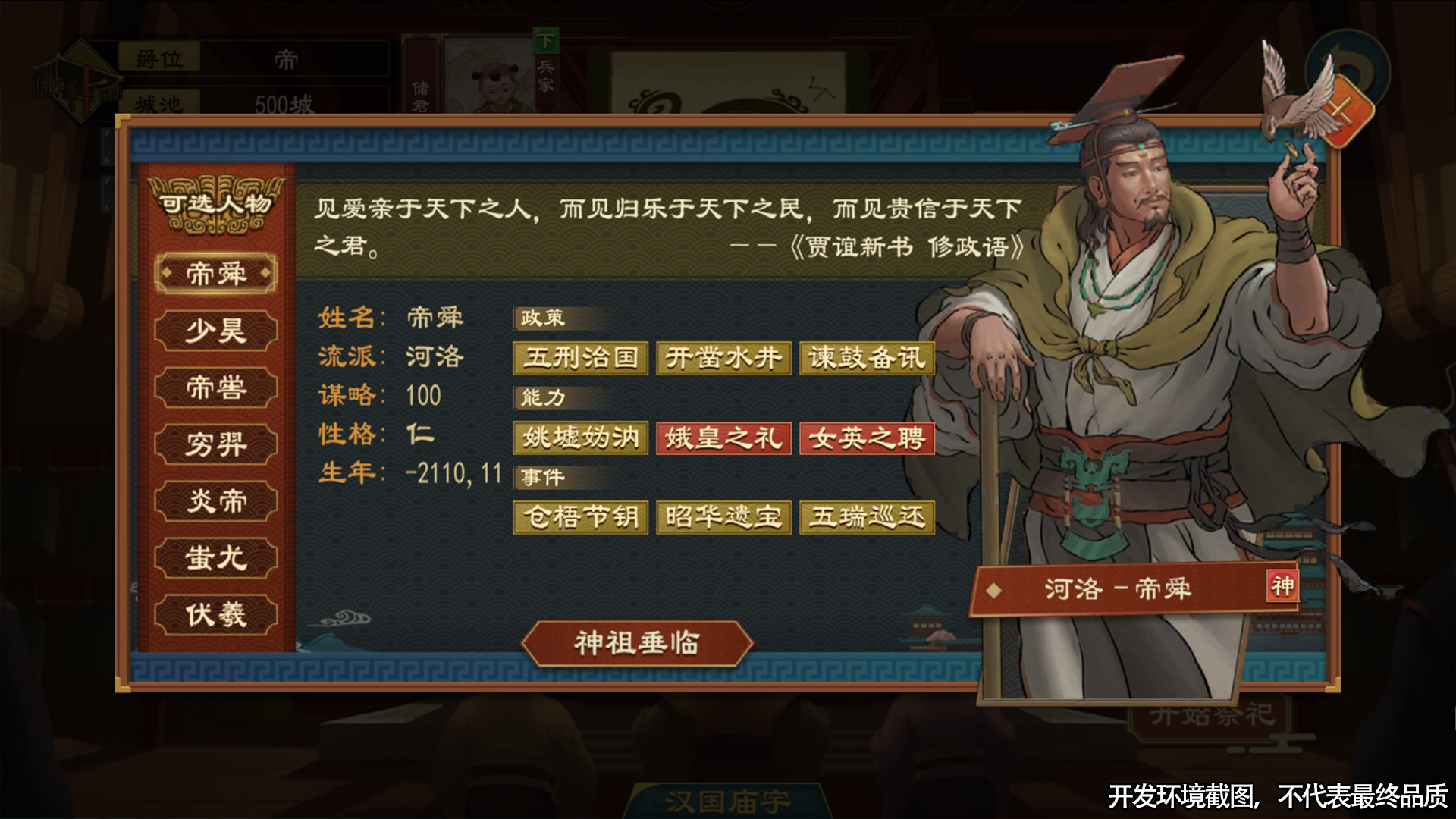 新版本将对国族阶段做功能拓展,包含皇帝律令、封禅战略拓展、国号战略等。并新增禁军系统、白钢时代技术、神祖“帝喾”。