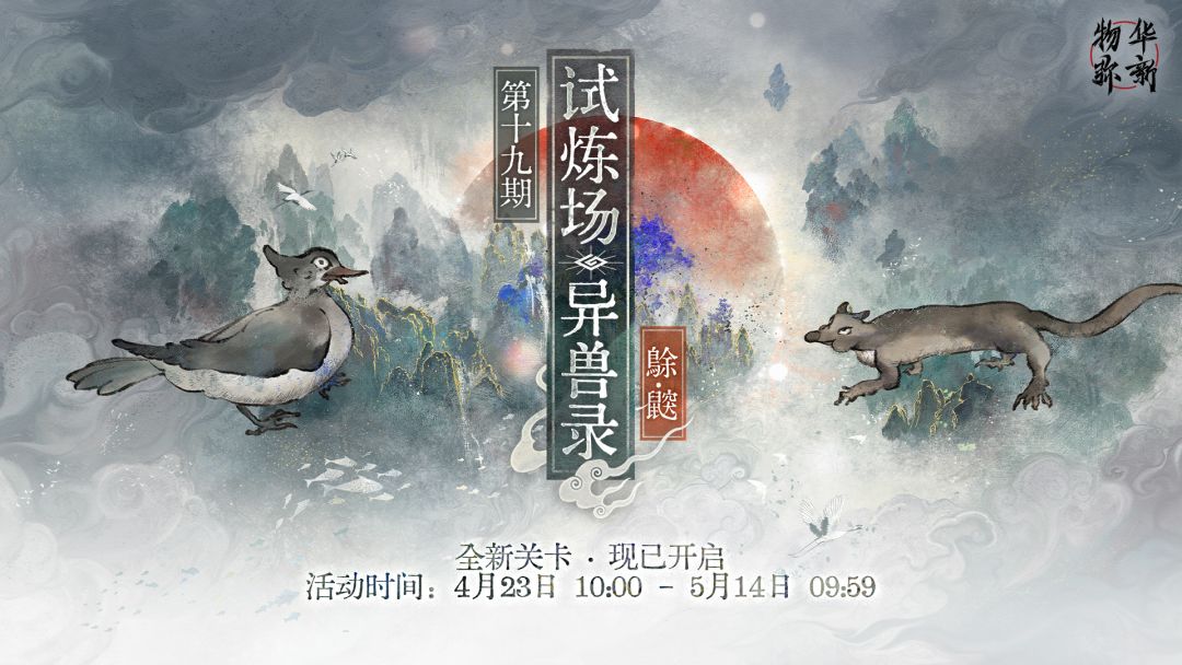 【活动时间】 4月23日 10:00 ~ 5月14日 09:59 【活动介绍】 限时试炼场「异兽录」第十九期更新“鵌”、“鼵”关卡,活动开启后收藏家可直接从【演训】-【试炼场】进入。 【活动奖励】 通关限时试炼场可获得1500个多棱灰珀。 ※ 「异兽录」“鵌”、“鼵”关卡开启后,「异兽录」“诸犍”、“孛马”关卡将关闭,常驻试炼【岁引干支】、【龙吟凤引(上)】、【龙吟凤引(下)】可在试炼场界面左下角