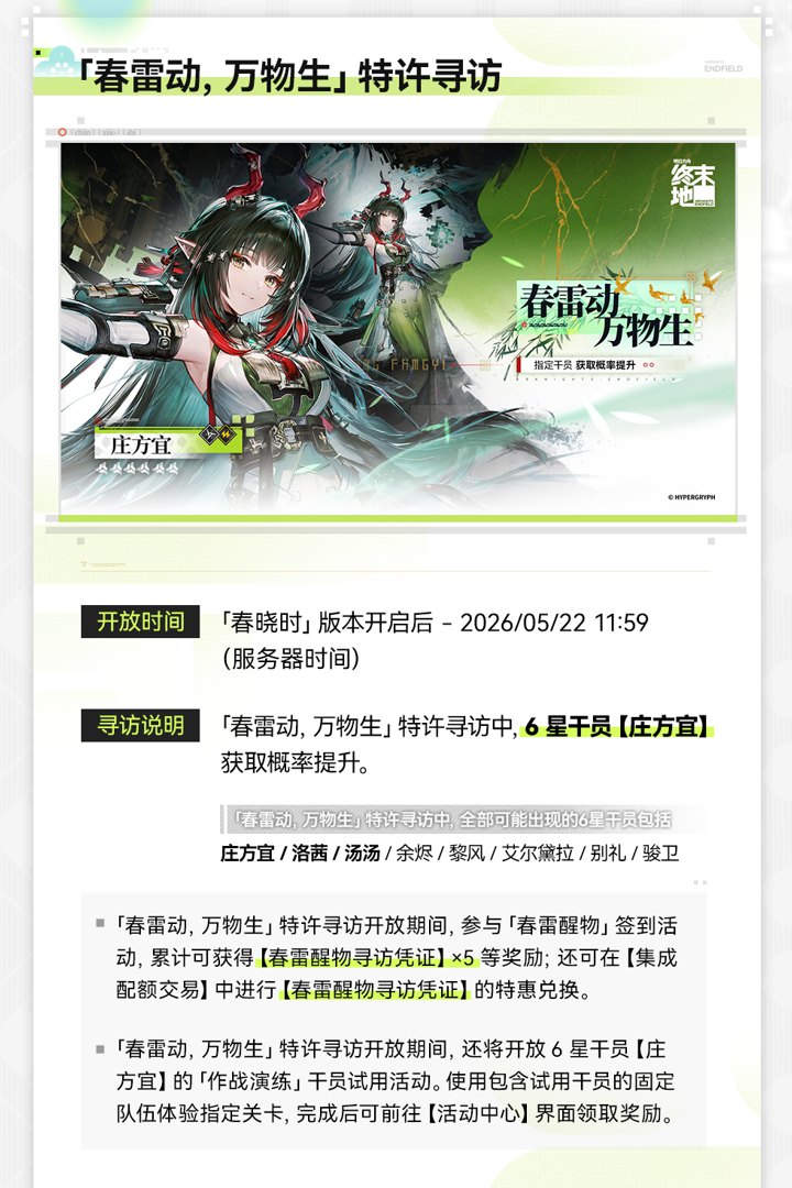 全新区域「清波寨」开放,6星干员【汤汤】获取概率提升!更多活动及玩法内容请关注官方公告。
