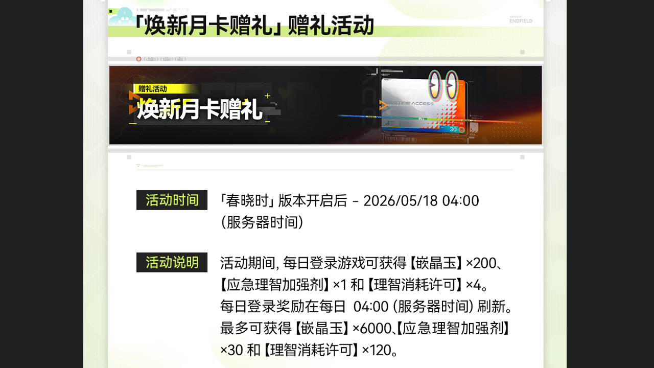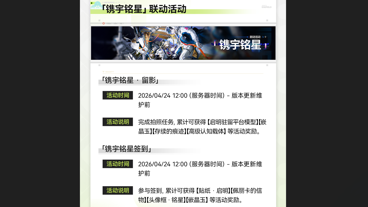 ▼//「镌宇铭星签到」 ■ 活动时间 2026/04/24 12:00(服务器时间) - 版本更新维护前 ■ 活动奖励 活动开放期间,完成3日签到,累计可获得【头像框·铭星】【贴纸·启明】【佩丽卡的信物】【嵌晶玉】等奖励。 ■ 参与条件 完成主线任务「第一章 - 进程Ⅰ - 基地解围」 ■ 活动说明 每日登录游戏即可领取签到奖励。 ▼//「镌宇铭星·留影」 ■ 活动时间 2026/04/24 12
