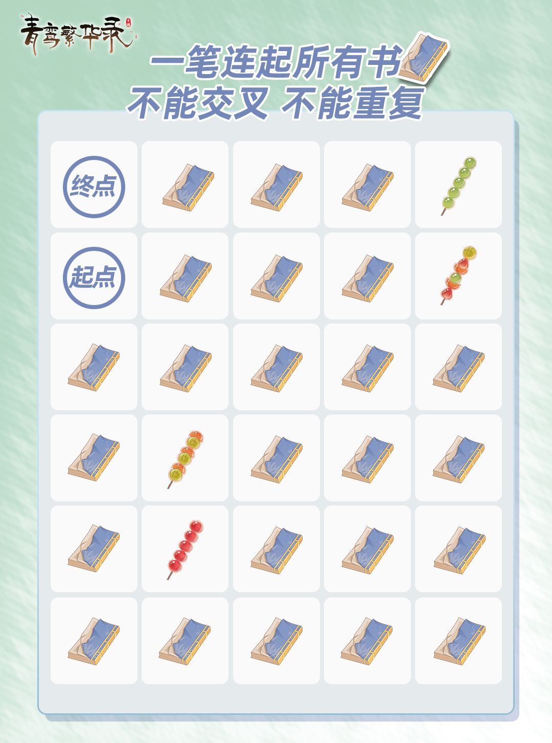 去年的今天曾许下读100本书的诺言,如今已完成了零头,居然是0! 啊啊啊啊flag又倒了!是忏悔,是弥补,是赎罪! 今天就一口气把这里的书都看完! 主上也来试试看吧,小心不要被美味的糖葫芦诱惑哦~ ▮活动时间 即日起——2026年4月27日14:00 ▮参与方式 用一笔连起所有书,即可参与本次活动 ▮活动奖励 青鸾互动礼包*30(内含:绑金*388,紫气东来券*1,灵犀玉*5,养育积分*20)