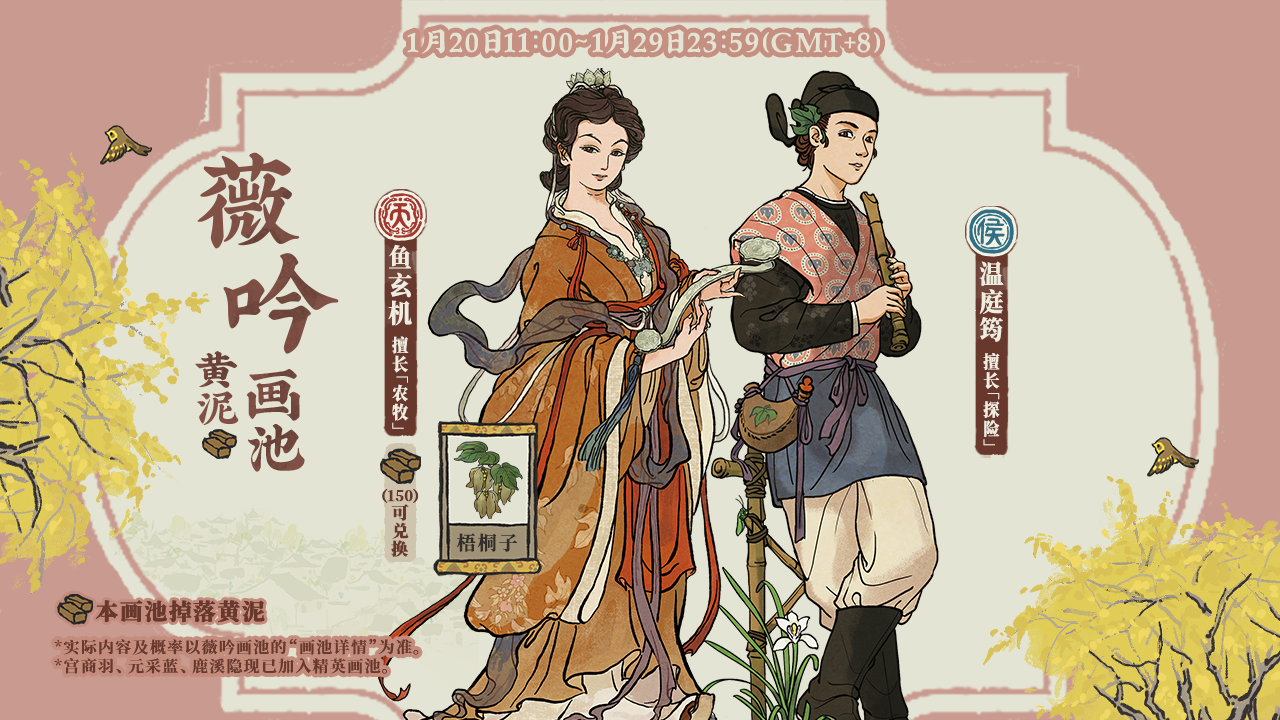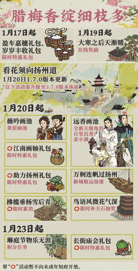 ⭐1月17日-1月22日⭐ -【盈车嘉穗】【岁岁丰收】限时特惠礼包开放购买; ⭐1月19日-1月21日⭐ -【大寒之后天渐暖】在线奖励开启; 累计游戏在线时间即可获取【半山阁】、补天石等奖励。 ————🌺以下活动需将游戏更新至1.7.0版本后方可体验🌺———— ⭐1月20日-1月29日⭐ -【薇吟黄泥画池】开启; 【鱼玄机】【温庭筠】概率提升。该画池可抽取鱼玄机专属珍宝【梧桐子】,该画池可消耗15