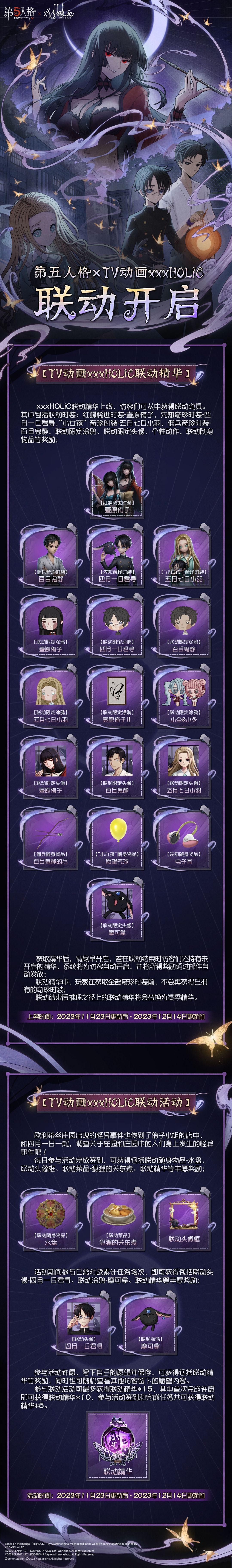 第五人格×TV动画xxxHOLiC 联动活动公告 请各位访客查收! 必然的相遇, 11月23日,让我们在欧利蒂丝庄园相约~ #第五人格# #第五人格IP联动# #第五人格×TV动画xxxHOLiC#