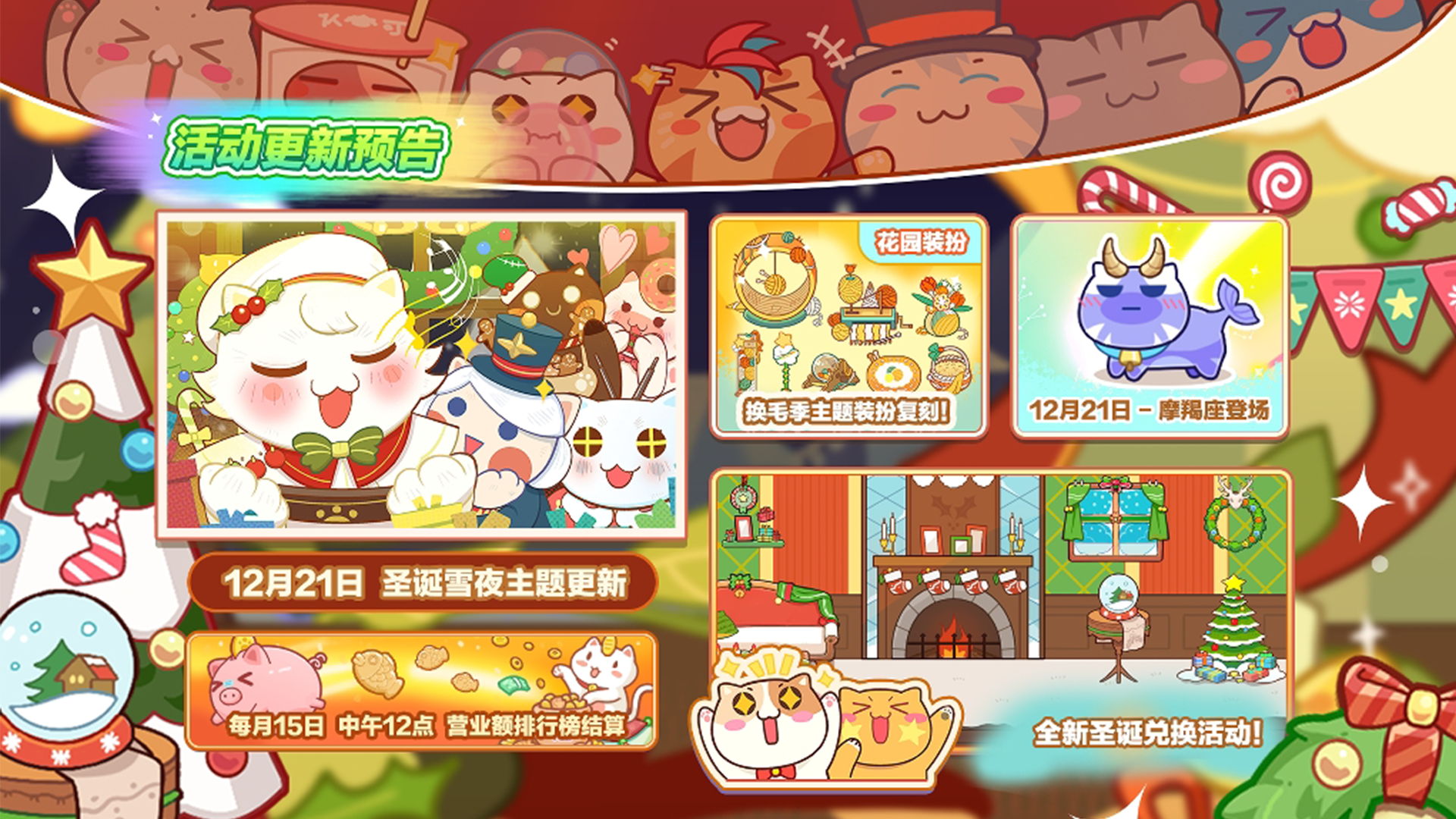超期待的「圣诞雪夜」将在月末12月21日正式上线啦! 2024年的圣诞又会有哪些新猫咪来到猫旅馆呢~ 芋头为大家带来了版本预告,一起来看看吧! ❗❗ 更新内容预告 ❗❗ ⭐圣诞雪夜版本限时活动猫咪卡池更新,头衔、头像框如期上线~ ⭐往期经典卡池复刻:圣诞节 ⭐复刻花园装扮:换毛季 ⭐S级星座猫:摩羯座登场,掉率提升 ⭐每日挑战兑换活动更新 ⭐更衣室优化 ==🐈当期卡池预告🐈== 卡池持续时间: 2