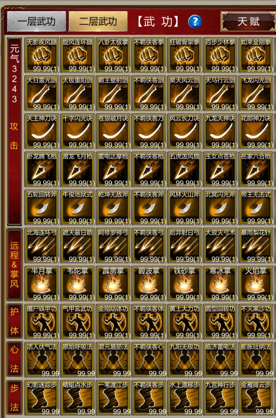 1.新增14种步法武功,1层步法使用1本武功书学习,二层使用3本相同武功书学习 步法获取: 1)部分武功在声望商店,使用声望兑换 2)部分武功在声望商店,使用荣誉值兑换 3)部分武功在蓬莱仙岛,怪物掉落神行经,10本神行经和隐士密录在煅造中合成 4)高层塔也可获得神行经 5)主线任务可获得不羁侠客步 步法修炼: 1)在长城以南移动或站立等非战斗状态,按时间获得经验,修炼速度一般#游戏安利
