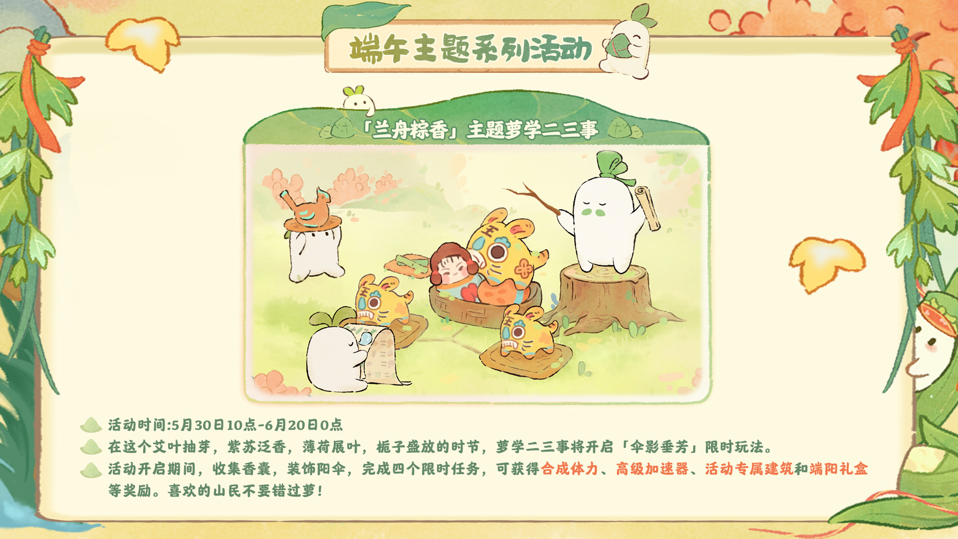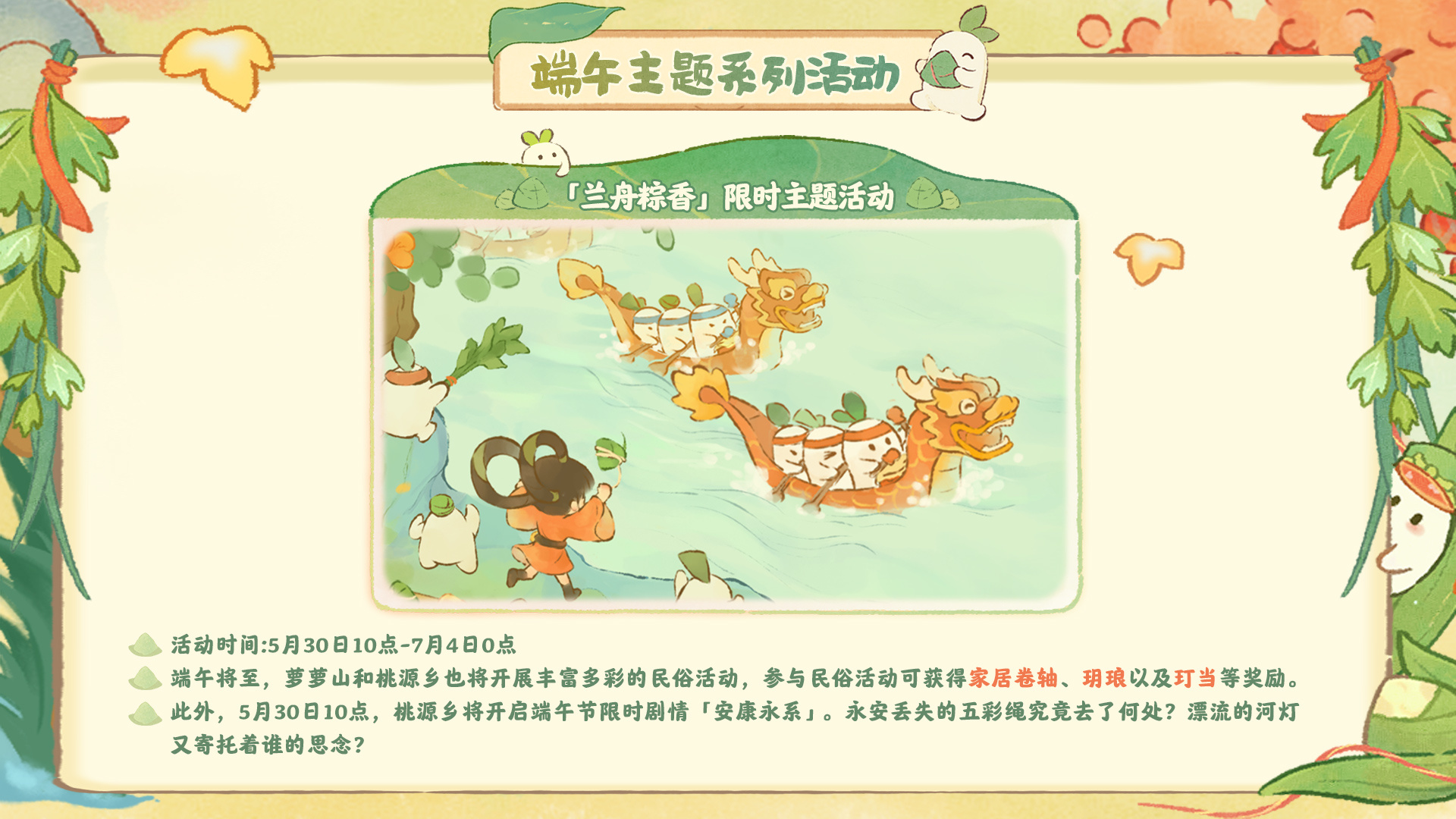 瑞龙吟啸端阳日,兰舟拂芰粽飘香。 各位萝萝山山民好呀!萝萝山全新端阳主题版本「龙吟端阳 兰舟粽香」5月30日即将粽香登场,就让小花给大家带来新版本的前瞻爆料内容萝! 端阳主题限时活动即将开启 端午将至,萝萝山和桃源乡也将开展丰富多彩的活动萝!参与活动可获得活动专属建筑、端阳礼盒以及玎当等丰厚奖励。同时端午节限时剧情「安康永系」也将一同开启,山民不要错过奖励啦! 端阳主题限时创物池即将登场 端阳桥头