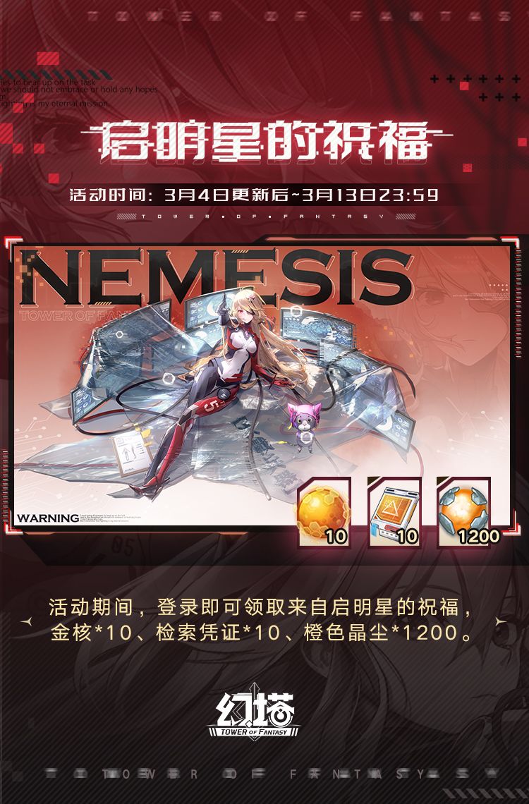 赦免降临,重启新生。「奈美西斯只是一个代号,我真正的名字是莎莉……我不会忘记。」 ++活动时间++ 2022年3月5日12:00至2022年3月25日4:59 ++活动说明++ ✦ 活动期间,拓荒者在“奈美西斯·订购活动”中可使用【赤核】进行订购。限定武器【启明星】获取概率将大幅提升,初次获取可解锁限定拟态【奈美西斯】。每次订购会额外获得1个【回火铸金】,每120个回火铸金可兑换1个启明星。 ✦