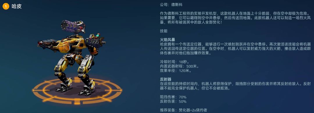 之前小坦介绍过:当被敌方集火时,“烧灼系列”武器的爆炸伤害可以在短时间内给予自身范围内的敌人造成超高伤害;那么本期小坦为大家带来的是与“烧灼”武器具有相似能力-“焚化”能力的机甲"哈皮"! 哈皮 名称:哈皮 类型:机甲 基础耐久:103680 速度:38公里/时 武器插槽:2x中型+1x重型 模块插槽:3х被动+1x活动 技能:火焰风暴 哈皮拥有一个传送定位器,能够进行一次喷射跳跃并在空中悬停