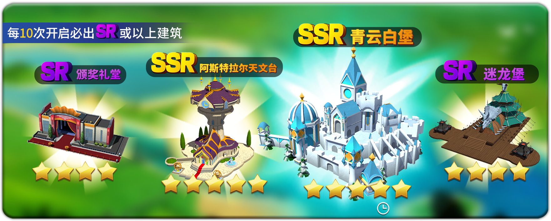 青霄阁现加入限时套餐礼包,青檐如洗,回廊缥缈。 建筑盲盒惊喜连连,赤色尖塔、鹿角铁堡限时开放抽取。 限时开启贴纸玩法,收集贴纸兑换稀有奖励。